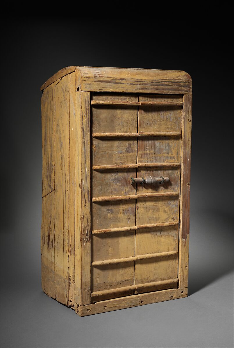 Two male figures, shrine, and fetishlike object were discovered by Metropolitan Museum excavators in a chamber in the enclosure wall of an elite tomb at Lisht South. The object of veneration found inside the shrine was called an imiut, "the one in the wrappings."