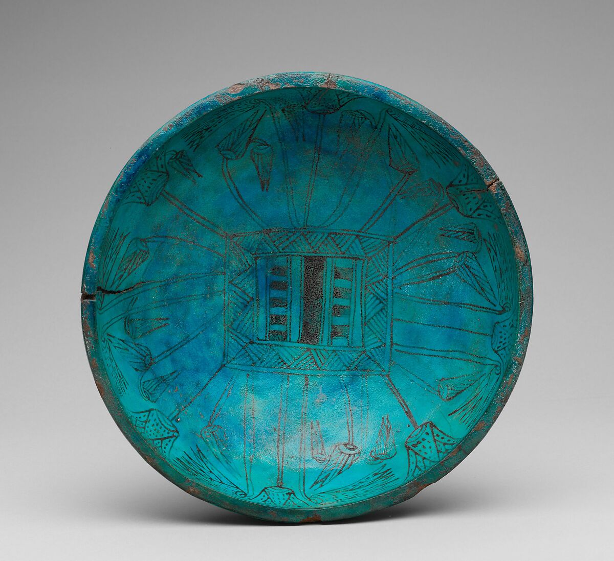 This beautifully preserved bowl was found with a scarab in the coffin of a woman named Teti, which contained the mummies of two adults and a child. The coffin (12.181.302a, b), the scarab (26.7.432) and the bowl are all on display in gallery 114.
