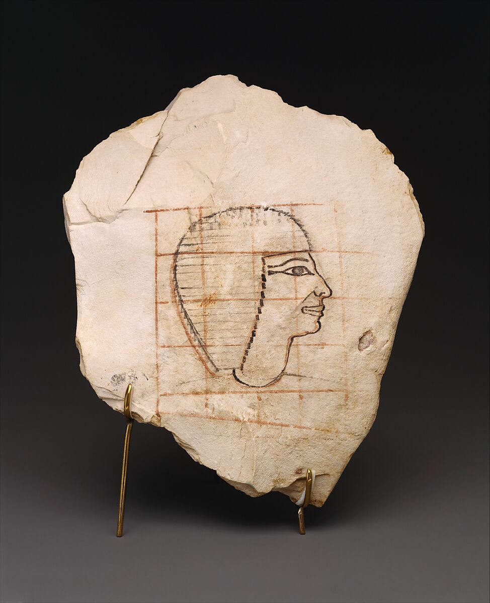 This gridded sketch of a man wearing a short wig undoubtedly depicts Senenmut, one of Hatshepsut's most valued officials. His appointment to a large number of important offices, such as steward of the god Amun at Karnak, enabled him to afford the excavation of an elaborate funerary complex consisting of an offering chapel (TT 71) and a tomb (TT 353) not far from Hatshepsut's temple at Deir el-Bahri in western Thebes. He also created a tomb for his mother, Hatnefer (36.3.1), and other family members on the hillside below.