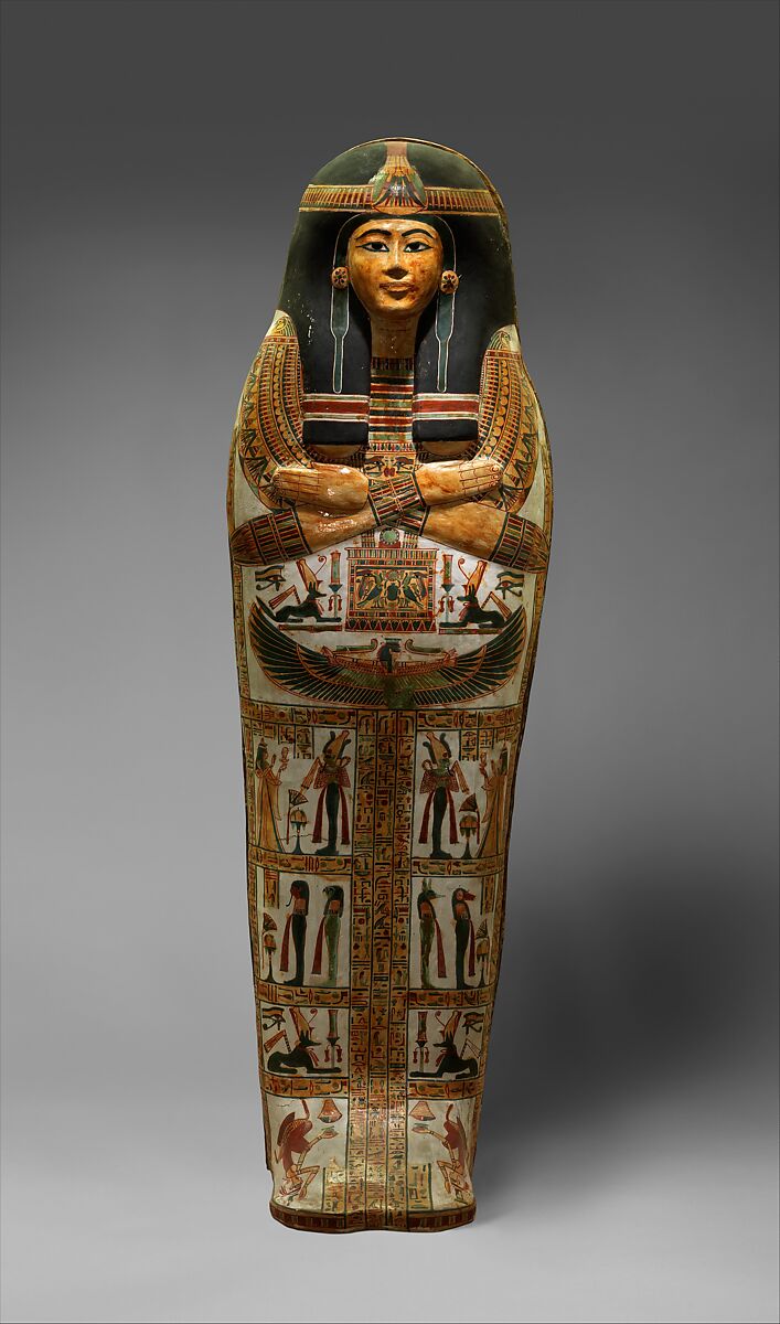 Chanteuse rituelle d’Amon-Rê, Henout-taoui mourut peu après ses vingt ans et fut enterrée dans une crypte préexistante, sans décorations. Cependant, les peintures aux teintes vives qui ornent l’ensemble funéraire compensent largement l’absence de couleurs aux murs. Les splendides illustrations du cercueil extérieur évoquent une momie enveloppée de linges blancs, dotée d’un masque funéraire et parée d’un collier d’amulettes. Sur les côtés et le bas du corps, des hiéroglyphes sur bandes jaunes (or) entourent des scènes miniatures où Henout-taoui honore Osiris et les divinités protectrices en-deçà. Sur le pied du cercueil, les déesses Isis et Nephtys expriment leur deuil. Elles sont dessinées à l’envers, de façon à être vues depuis le masque qui couvre la tête de Henout-taoui.