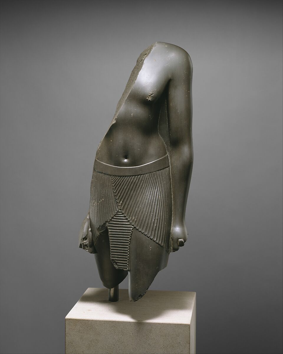La colonne au dos de ce torse a été cassée à l’endroit où était inscrit le nom de la personne représentée. Cependant l’inscription restante indique que l’homme avait rang de général et décline les charges qu’il assumait à Busiris, une ville du delta du Nil, et à Abydos, centre du culte d’Osiris dans le sud de l’Égypte. La facture raffinée du bras et de la poitrine, qui met l’accent sur les parties charnues du corps, préfigure le style ptolémaïque. Bien que ce chef-d’œuvre soit plus ou moins contemporain de l’art classique grec tardif et qu’il soit concevable que les sculpteurs égyptiens aient vu des œuvres grecques, son style ne renie en rien la tradition égyptienne, qui avait été relancée au cours de la XXXe dynastie (380 – 343 av. J.-C.).