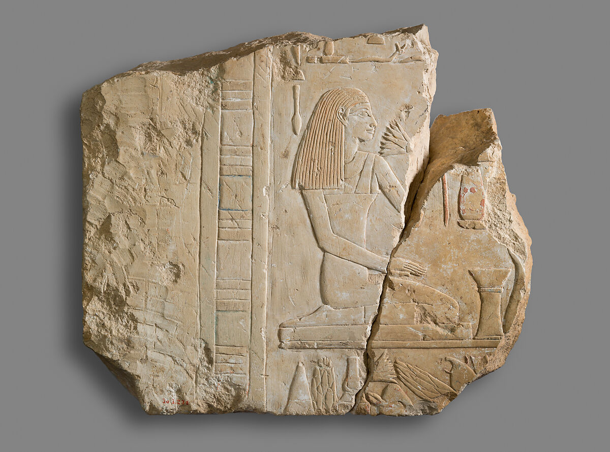 This fragment of relief was part of the decoration of a statue niche in the offering chapel of Senenmut (TT 71). The hieroglyphs above the kneeling woman probably identify her as "his (Senenmut's) beloved sister Ahmose." This reconstruction of the partly missing text is reinforced by the inscription o a wooden Osiris figure dedicated to a woman named Ahmose (36.3.231) that was discovered in the debris below the chapel.