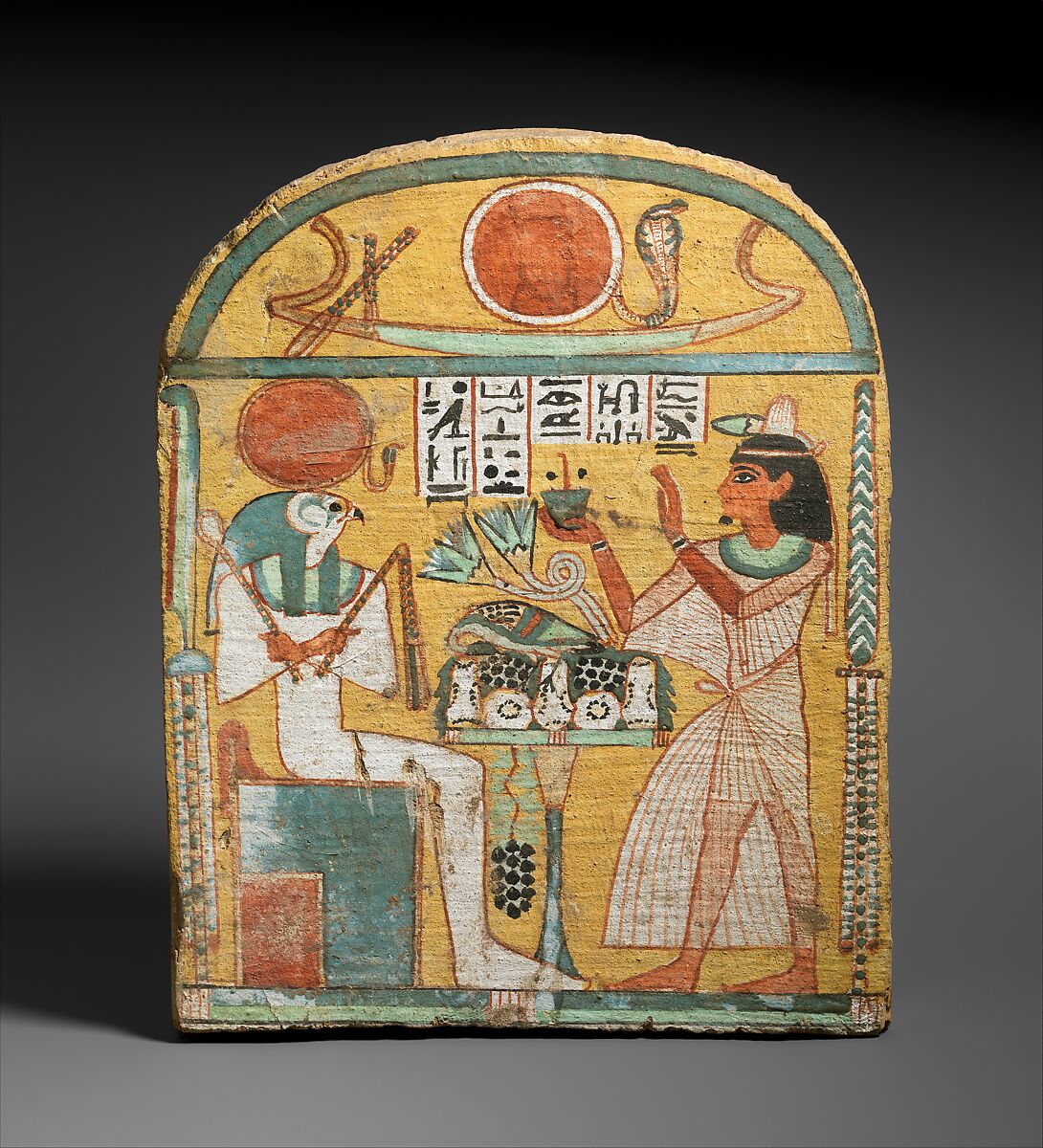 The small wooden stela is topped by the solar barque in the sky, which is supported by the emblems of the east (on the right) and the west (on the left). Aafenmut, identified here as a Scribe of the Treasury, offers incense to the seated sun god, Re-Harakhty, who is shown as a mummy with the head of a falcon. Aafenmut is in festival dress, wearing a pleated, diaphanous robe, a broad collar, and bracelets. On his head is a cone of scented wax and a lotus bud. Between the two figures is an offering table piled high with bread, fruit, and flowers.