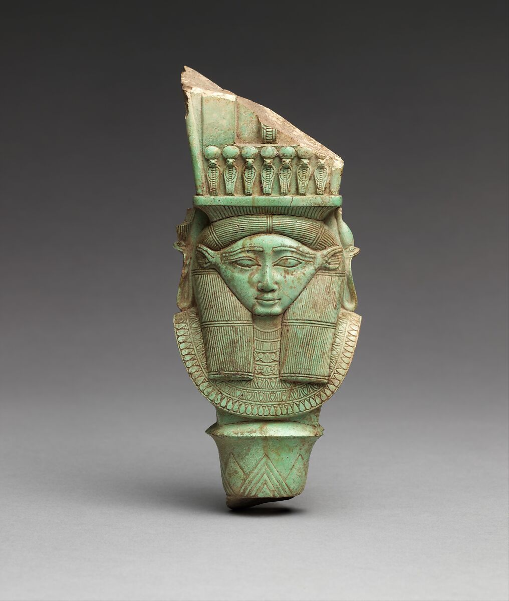 This is a fragment of a faience sistrum, or rattle. It may or may not have actually functioned as an instrument, but it certainly functioned as the icon and fetish of great goddesses.The goddess head sits above a large collar composed of tube and drop beads and floral elements. Her face is surrounded by a straight wig bound with horizontal ribbons. On either side of the wig appear uraei wearing elongated crowns of Upper and Lower Egypt. On her head she wears a cornice, and above that is a frieze of uraei crowned with sun disks; above these again is the broken lower part of the naos (chapel) -form frame for the sound elements. Within the naos sat another uraeus whose lower part can be seen. On either side diagonals of the ascending volutes typical of naos-form sistra can be recognized. Beneath the head and collar of the goddess remains the upper part of the handle of the sistrum that has the form of a papyrus umbel.