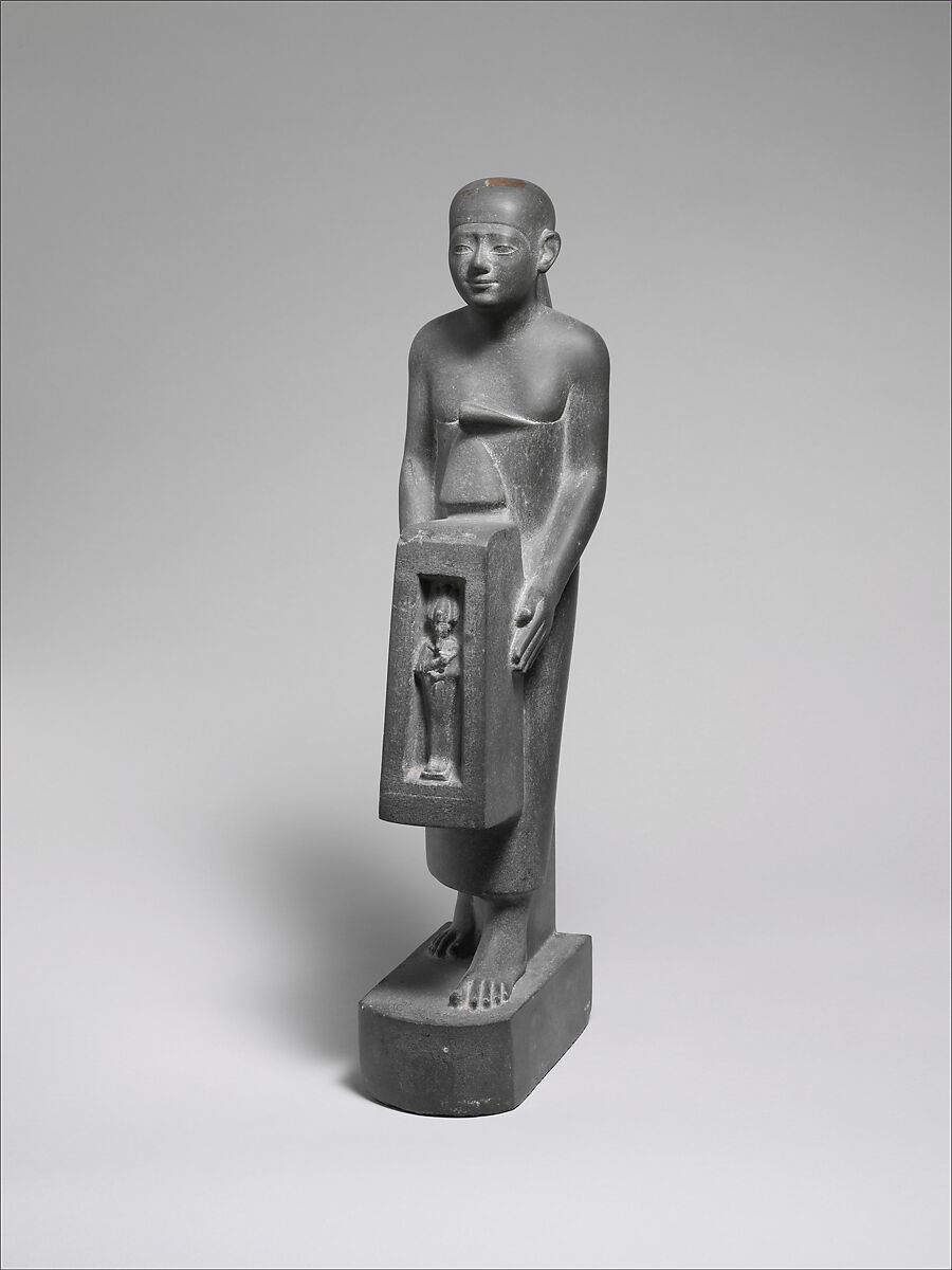 This man places his open hands on either side of a small naos containing a statuette of Osiris. He wears a close-fitting cap and a long wraparound garment whose ends are gathered in a roll and tucked in at the chest. A slight smile appears on his smooth round face, and raised rims give a bit of emphasis to his eyes. The simple clean lines of the large figure are reinforced by the subdued sheen of the fine graywacke.