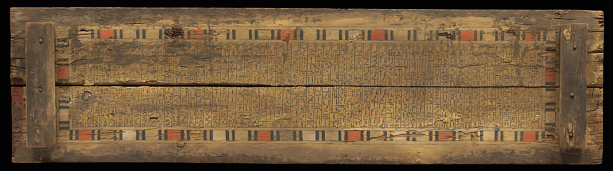 The lid, made of two planks pegged to battens, is inscribed (like the lower part of all four sides) with religious spells known as Coffin Texts in a cursive script. On the long east side is a false door, an offering table piled with food , an offering list, and stands bearing scepters, staves, and jewelry. The west side depicts clothing, toilet objects, and a headrest, also laid out on tables and stands. The floor of the coffin is covered with texts in two "islands" surrounded by blue bands signifying water. Painted on the head and foot end are sacred oil vessels and sandals.