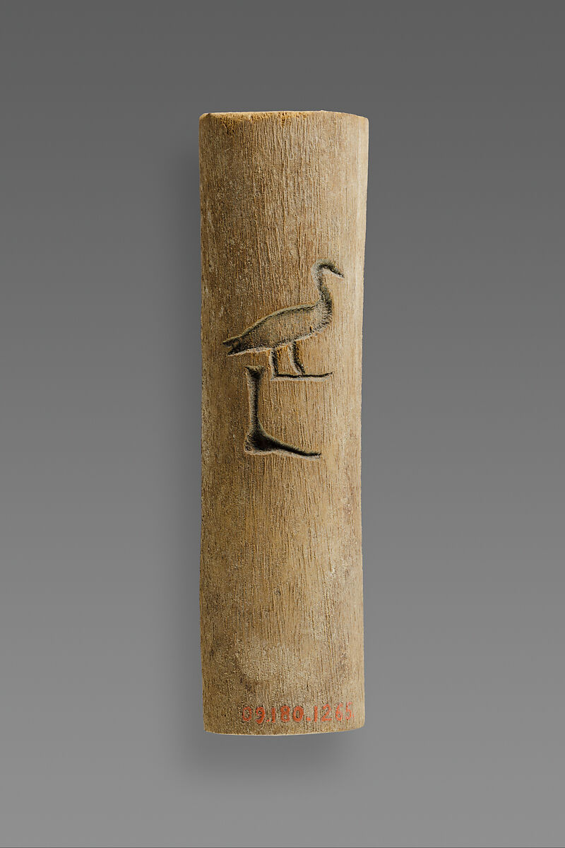 This wooden cylinder may come from a ceremonial flail of the type held by kings and buried with nobles (see 12.183.15a–g). Two hieroglyphs, which could be read as Sab or Geb, are incised on the surface; these were once filled with blue paste.