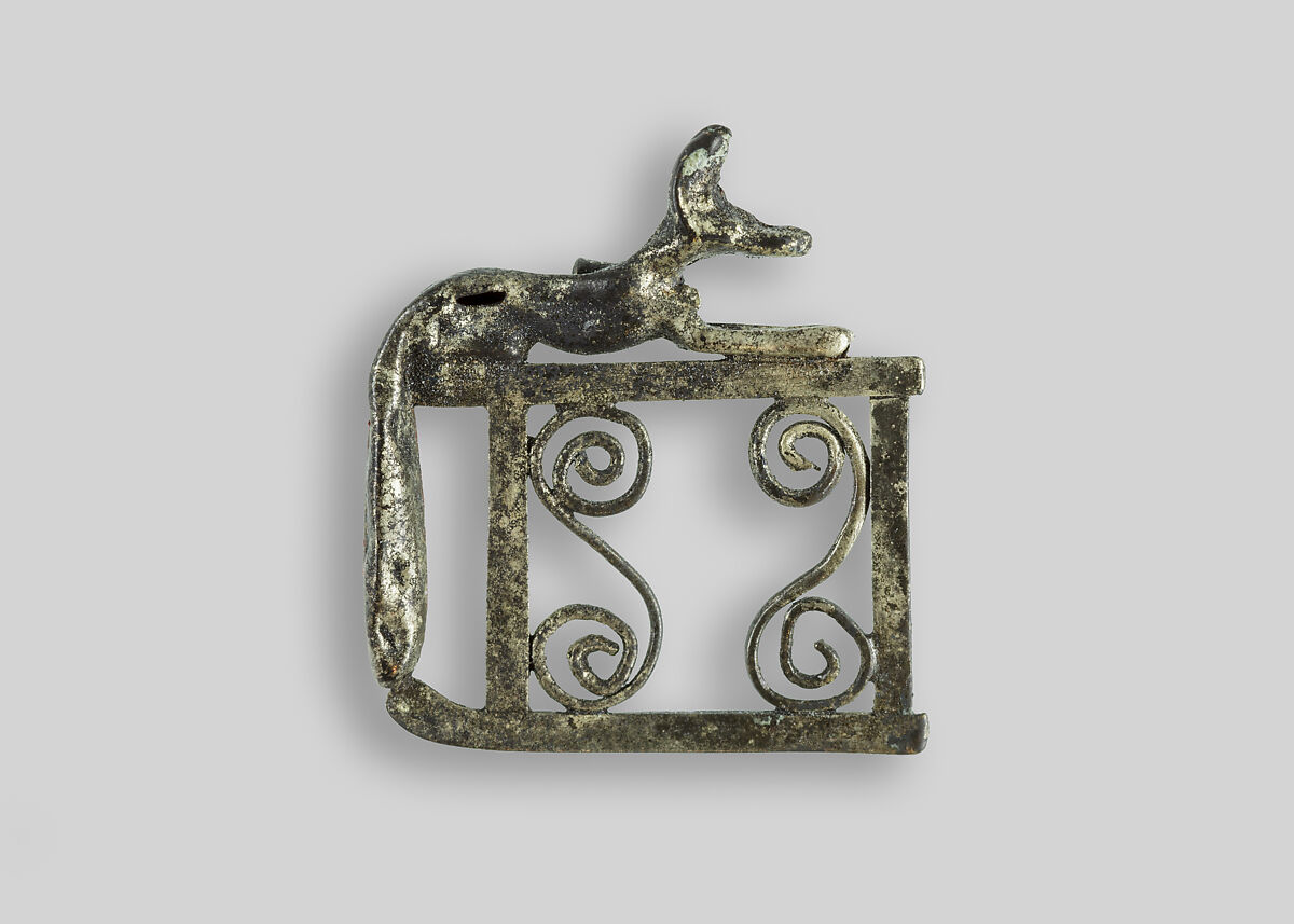 This delicate amulet, representing a jackal recumbent atop a shrine, was found in a tomb at Abydos along with several other silver objects. The jackal here most likely represents either Anubis, god of embalming, or Wepwawet, the deity who escorted the deceased into the afterlife.