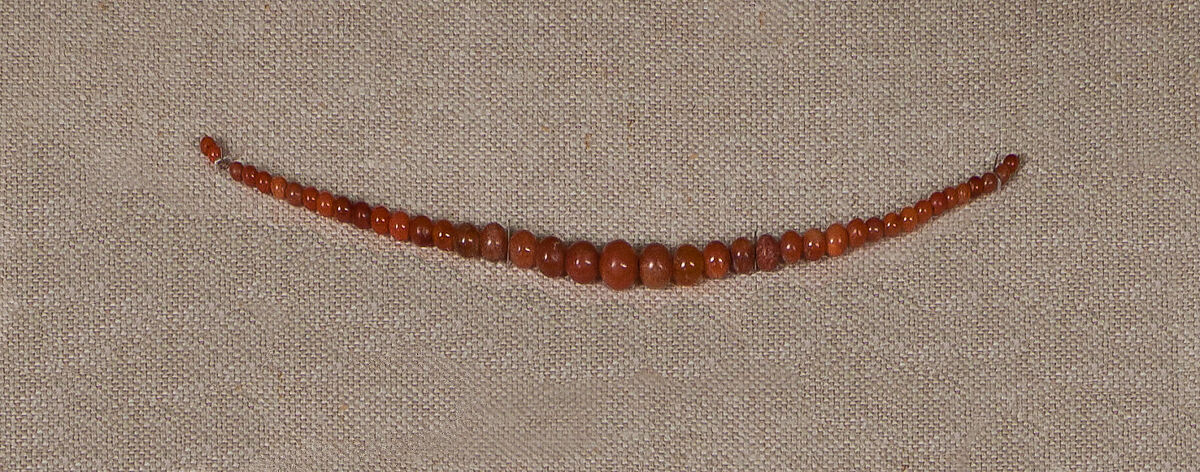 Thousands of beads of carnelian, amethyst, quartz, gold faience, and shell were discovered in the surface sand, or radim, of the North Pyramid at Lisht. These have been assembled into a number of necklaces, such as this example, composed of carnelian ball beads.