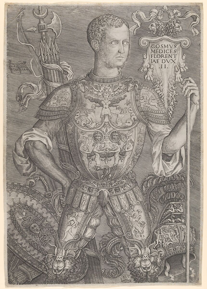 Portrait of Cosimo de' Medici in full armor, his left hand resting on a staff