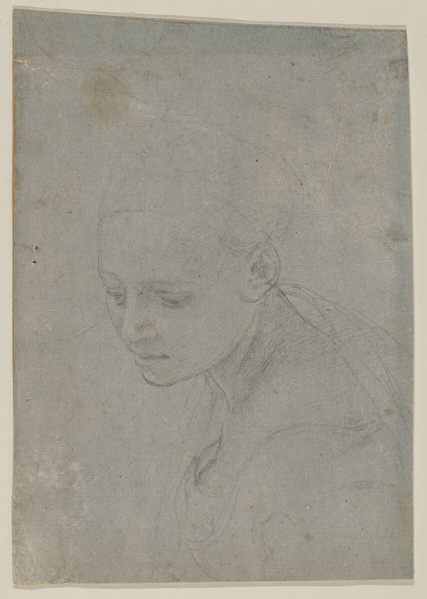 The figure in the Met’s sheet is closely observed from life without embellishment of head or body. As seen here, in almost all of Bronzino’s figure studies for paintings of the 1530s and 1540s the individual identity of his models in both a physical and psychological sense shines through. Drawn in black chalk on unprepared off-white paper, and also very closely related in style, the study of ca. 1543-45 for the head of the aristocratic woman onlooker toward the center in the Besançon version of the altarpiece of the Lamentation portrays the model wearing a simple, adherent cap instead of the eventual, intricately jeweled coiffure (Gabinetto Disegni e Stampe degli Uffizi 10894 F, Florence). Moreover, the fine, portrait-like features of the woman in the Uffizi study, in which the sharp angle of view adds to the mood of nearly familial intimacy, assume in the painting the idealized physiognomy of a marble Roman matron, who is meant to be dressed like a lady in the Duchess Eleonora di Toledo’s court. In the Met’s sheet, the bodice of the woman’s humble dress and a veil or shawl wrapping over her left shoulder are also lightly indicated. Some tendrils of hair are evident toward the right side of the forehead. The short nose with an almost rectilinear nostril, the small, somewhat square chin (which is very forcefully outlined), and the smooth fleshiness of the cheeks communicate the quiet, portrait-like dimension of this particular study of the living model. This is yet a further hallmark of Bronzino’s figural style and approach in his life drawings of the early 1540s: as seen here, many, subtly naturalistic details closely observed from the model begin to inform the limpid clarity of form, with outlines always delicately descriptive, and with interior modeling that always clearly defines the sculptural values of the figure. As is also characteristic for Bronzino at this time, the contours defining the figure throughout the Met’s drawing pulsate with dynamic effects of tone: the outlines vary in darkness and light in concert with the inner modeling, and dark outlines are often immediately edged with light. Evident only close-up, so subtle is the pulitezza (the ideal of cleanliness) of Bronzino’s draftsmanship, are the lighter strokes of the chalk in minutely parallel, searching outlines that ubiquitously accompany the firmer, bolder contours. Light catches the outline of the neck as if it were a delicate edge of form in a way that is entirely typical of his drawings of the late 1530s to early 1540s. Her head is inclined with an elegant though credibly life-like turn of the long neck as she pensively lowers her eyes; her mouth with just a hint of the parting of the lips communicates life, as if the figure had momentarily arrested breathing. It is this immediacy and the portrait-like individuality and naturalism which Bronzino all too often thoroughly sacrificed in his finished paintings (though not in the Medici portraits), almost to the point of lifelessness, in order to produce the monumental, profoundly idealized, abstracted figures that intricately inform the complex layers of illusionistic form and iconographic meaning in his elegant compositions. This is especially the case in the virtuosic fresco program of the Chapel of Eleonora.