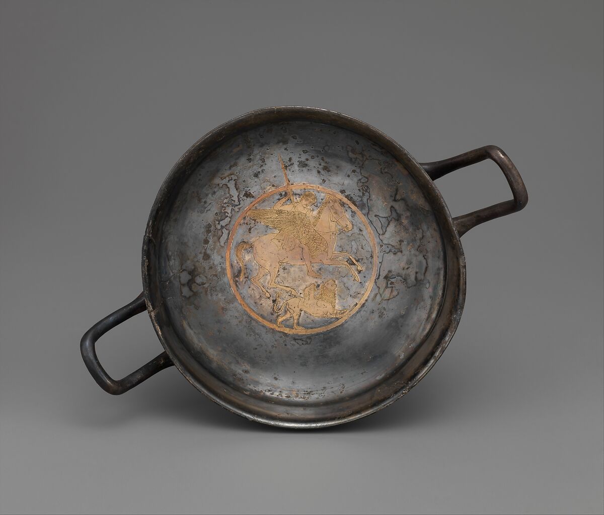 The hero Bellerophon rides Pegasos, the winged horse, as he battles the Chimaera, a mythical creature with the heads of a lion and goat and a tail in the form of a snake. According to legend, Bellerophon and Pegasos both hailed from the region around Corinth, and the myth of their battle with the Chimaera first appears in Greek art on Corinthian painted pottery of the eighth century B.C.