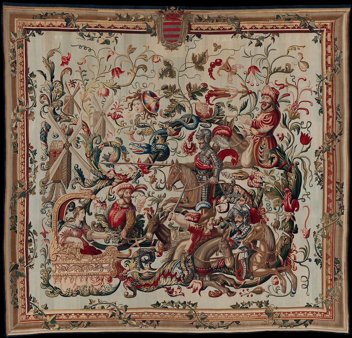 This wickedly comic tapestry belongs to a gloriously unconventional series that tells the Story of Don Quixote within a system of so-called ‘grotesque’ ornament. Exemplifying the finest of London’s tapestry weaving, made at the apex of the city’s foray into this industry in the third quarter of the seventeenth century, this piece is a truly original combination of narrative and pattern-making – elegant, imaginative, witty, with touches of burlesque. That it retains for the most part its spectacularly bright and colorful palette makes it still more desirable.