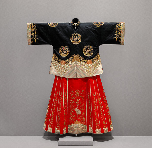 This ensemble reflects a trend in early twentieth-century wedding attire, when Chinese artisans looked to easy-to-wear, European two-piece styles for inspiration while maintaining local elements. The straight-cut jacket resembles a Qing official’s robes, and the pleated skirt is derived from a popular type known as the “horse-face skirt” (mamianqun), a reference to the rectangular frontpiece. Sumptuously embroidered cranes and stalks of grain are auspicious symbols of longevity and fortune that would bless the marriage.