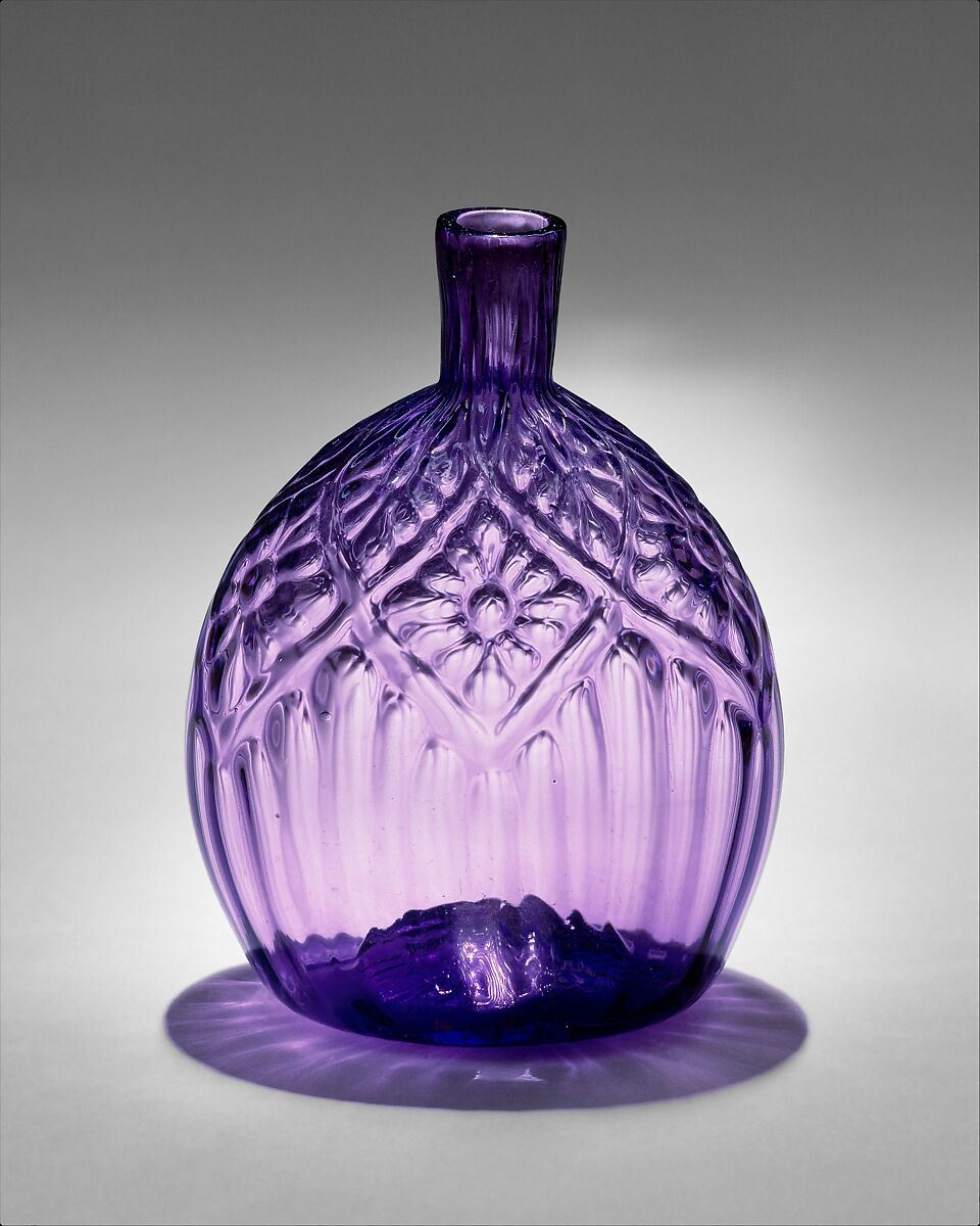 Voulant contrer la domination des importations européennes, Henry William Stiegel, entrepreneur américain, fonda l’American Flint Glass Manufactory à Manheim, en Pennsylvanie. Ses artisans, tous immigrants, sont à l’origine des premiers services de table élégants du Nouveau Monde. Outre le verre incolore, la manufacture produisit des verres aux riches coloris améthyste et bleu cobalt. La marguerite enfermée dans un diamant qui décore ce flacon est probablement copiée d’un motif populaire en cristallerie.