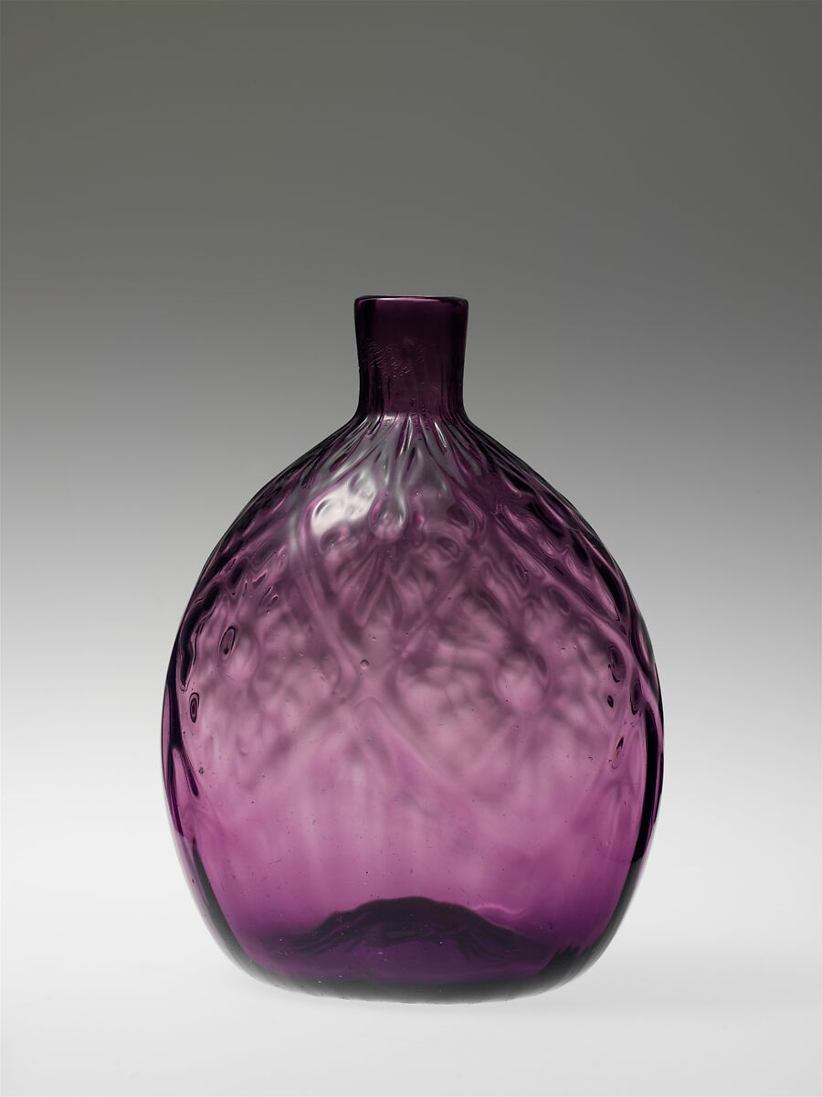 The diamond-daisy pattern on this amethyst-colored pocket bottle may have been introduced by Stiegel; it is not found on European examples. Many variations of this popular design exist, as seen in other pieces in the collection (see 34.65 and 14.74.17).