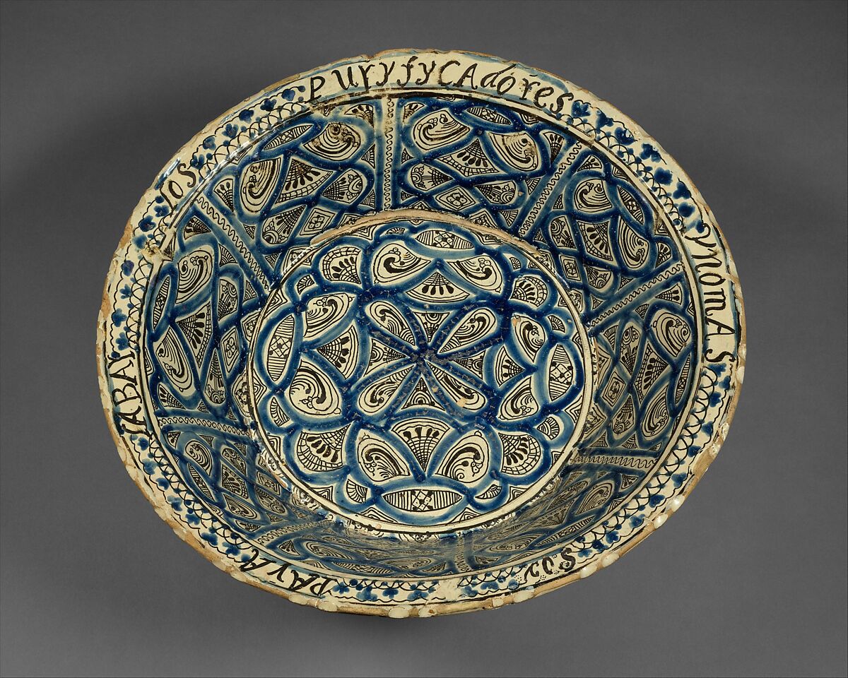 Emily de Forest rightly considered this mid-17th-century basin to be the most important piece of pottery in her collection. Made by an artist who marked it with the initial “A,” this flat-bottomed lebrillo is decorated with a bold pattern of cobalt blue lines whose interstices are filled with fine black lines and dots that imitate lacework. The inscription encircling the rim of the basin indicates that it was made for the sole purpose of washing purificators, the altar linens used to wipe the Eucharistic chalice after Communion.