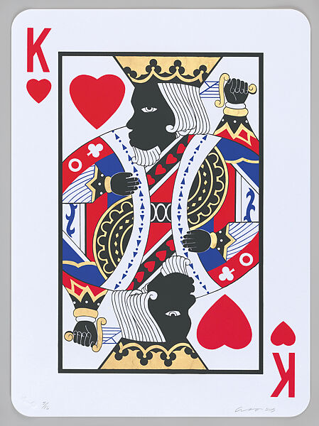 In Game Changing, Derrick Adams responds to a variety of social, historic, and cultural sources including Romare Bearden’s depictions of African-American life, objects from everyday life (such as playing cards), Henri Matisse’s celebrated Jazz, David Hammons' 1969 Spade (Power to the Spade), and the legacy of concepts of nobility and royalty. Adams uses a bold palette of red, black, white, blue, and gold to create the royal suite (king, queen, jack, and ace) found in playing cards. By making his figures all African-American, the artist challenges the way representations of Caucasians have dominated quotidian objects, such as playing cards, and what such an exclusionary practice means when one come to approach such images as “normal” without thoughts to possible alternatives.