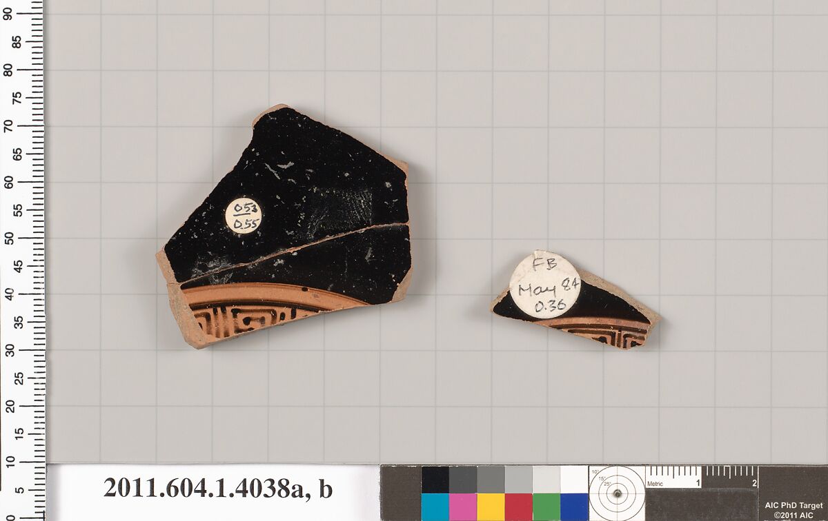 Two fragments with part of meander pattern on the interior and part of circumscribed palmettes, volutes, and tendrils on the exterior