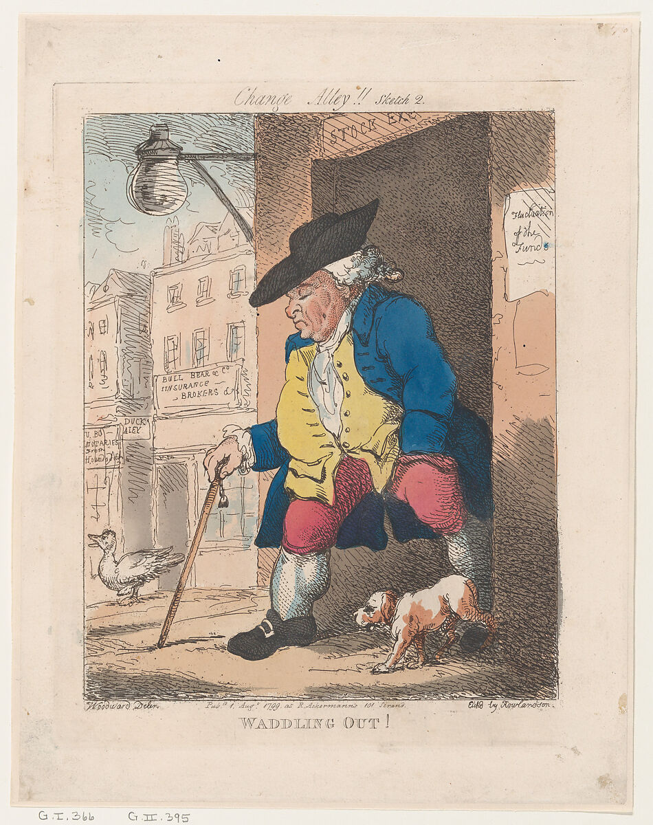 Companion print to Waddling In! (59.533.625), and one of series after Woodward showing city businessmen participating in the stock market. This shows a man headed out of the stock exchange, dejected at his losses. with the lintel lettered "Stock Exch...", a sign at right advises: "Fluctutation of the Fund" and a building in the right background is identified as "Bull, Bear & Co. Insurance Brokers."