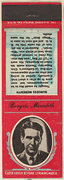 - Title: Burgess Meredith from Movie Stars Match Cover design series (U21) issued by Diamond Match Company