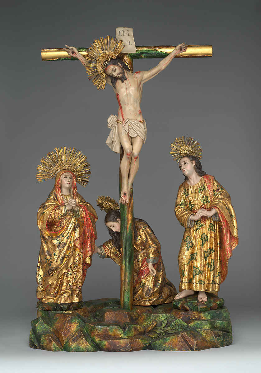 - Dimensions: Overall: 21 5/8 × 36 1/4 × 13 3/8 in. (55 × 92 × 34 cm); Christ: 16 15/16 × 13 3/4 in. (43 × 35 cm); Cross: 32 11/16 × 18 7/8 in. (83 × 48 cm); Virgin Mary: Height: 16 15/16 in. (43 cm); Saint Mary Magdalene: Height: 11 13/16 in. (30 cm); Saint John the Evangelist: Height: 17 5/16 in. (44 cm)
