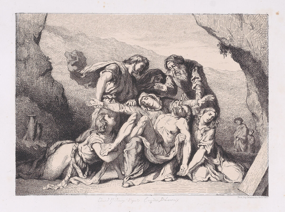 This etching reproduces Delacroix's Pietà completed in 1844 in Saint-Denys-du-Saint-Sacrement, Paris. It was published first in the journal "L'Artiste" on February 2, 1845, but this impression comes from an 1852 publication "Les Peintres vivants," a collection of one hundred prints after living artists. Delacroix must have appreciated Hédouin's work because that same year, according to his Journal, he supplied the etcher with six sketches. Delacroix had an abiding concern for his legacy and one of the ways he hoped to ensure his reputation was through the circulation of his compositions in print.