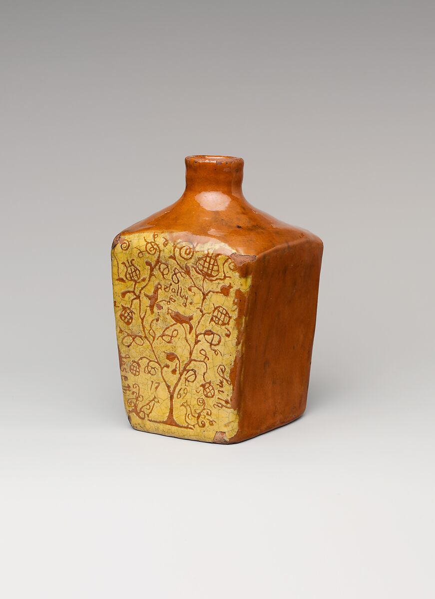 This earthenware tea canister is one of the earliest known dated examples of American pottery. Although decorated in the Pennsylvanian German decorative technique of sgraffito, it displays the potter's attempt at emulating the fashionable English, salt-glazed, stoneware tea caddies of the 1740s and 1750s. This redware caddy, however, is much larger than its English prototype and the naive design of the tea plant bears little resemblance to that of the English salt-glazed original.