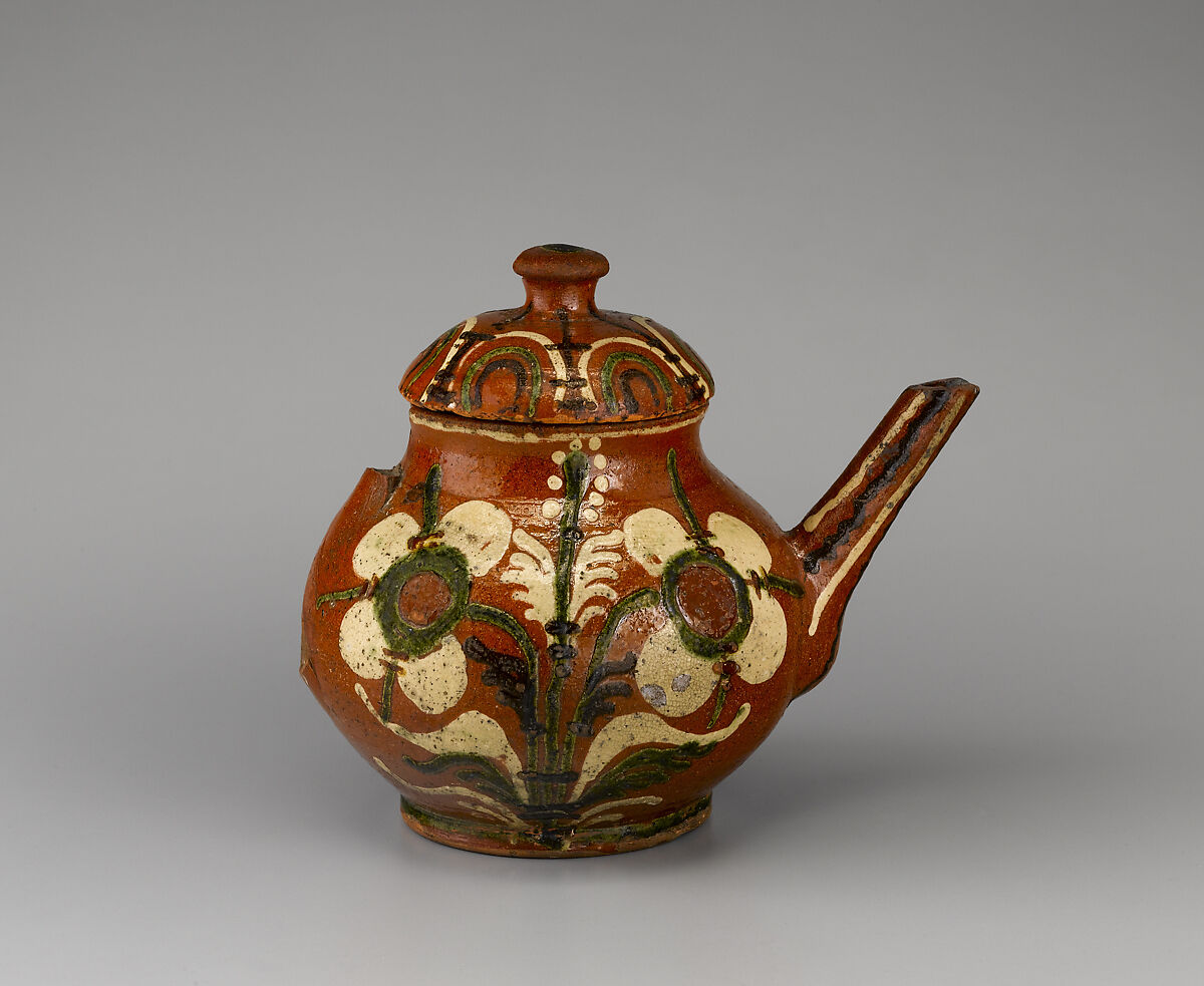 Although the style of slip-trailed decoration and the floral motifs relate to Southern examples, new research suggests that these pieces may have been made in Pennsylvania.