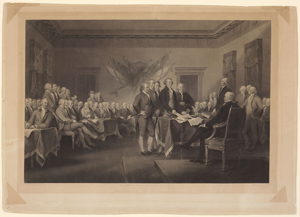 Here, Thomas Jefferson and his editorial committee stand inside the Pennsylvania State House and present a draft of the Declaration to the Second Continental Congress on June 28, 1776; it would be formally adopted on July 4. Forty-two of the original signers and six additional patriots are portrayed. Trumbull began the related painting under Jefferson’s guidance in Paris, in 1786. The artist’s insistence on depicting as many figures from life as possible delayed completion until 1820. It then took Durand, one of America’s first master engravers, three more years to complete this print, which helped make the image ubiquitous.
