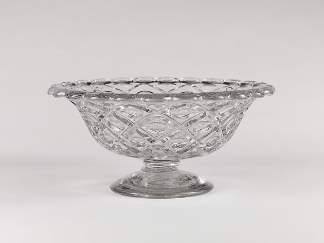 With the development of new formulas and techniques, glass-pressing technology had improved markedly by the late 1840s. By this time, pressed tablewares were being produced in large matching sets and innumerable forms. During the mid-1850s, colorless glass and simple geometric patterns dominated. Catering to the demand for moderately-priced dining wares, the glass industry in the United States expanded widely, and numerous factories supplied less expensive pressed glassware to the growing market. At the Exhibition of the Industry of All Nations at New York’s Crystal Palace in 1853, for example, the New England Glass Company exhibited 130 pieces of one design, "consisting of bowls, tumblers, champagnes, wines, and jelly glasses." This object belongs to one such service. Although the glass manufactory is not known, the glassware is very typical of the large services that were very popular with America’s middle class in the nineteenth century.