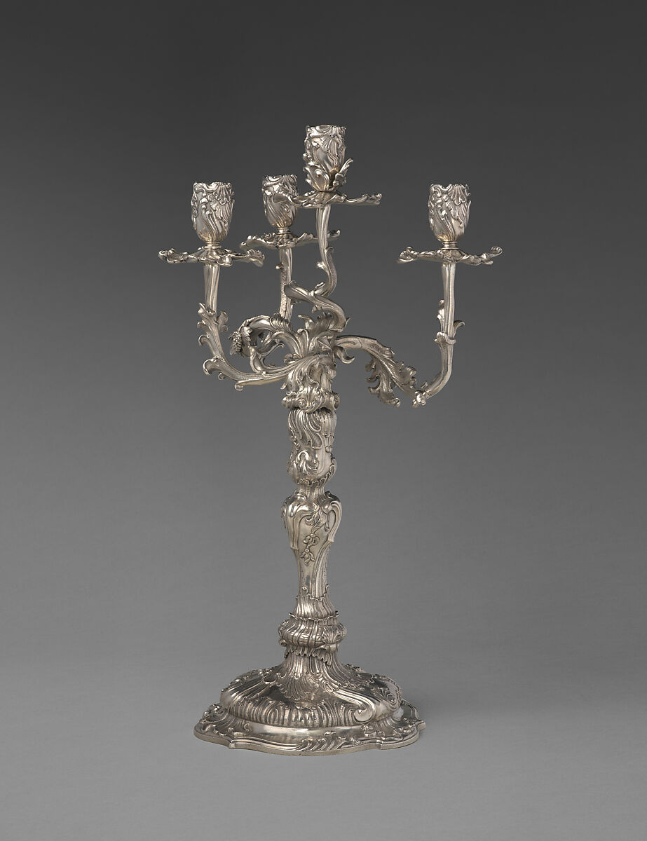 These two extraordinary candelabra are the first and second made for an ensemble of 36 candelabra and 100 candlesticks made for Frederick Augustus II, Elector of Saxony and as August III, King of Poland (1696–1763). As the first in the set, they were likely the prototypes shown for approval to the royal patron and his prime minister Heinrich Count von Brühl (1700–1763), who initiated the costly project. The goldsmith invested significantly in the commission, transforming the raw precious metal into works of great subtlety and power with virtuoso surface finishes and fine detail. Christian Heinrich Ingermann (1713–1778) was a leading artist of the Dresden court, and these candelabra exemplify the high caliber of his fashionable production. Applied across media, this Dresden iteration of the Rococo was an exuberant adaptation of the French style, heavy in naturalistic ornamental vocabulary like the delicate foliage on the four twisted branches of these candelabra and the dynamic tension of their composition. When united, the gleaming service of over 130 candleholders would have illuminated the Royal table, an impressive display both of stylish Saxon taste and of wealth in silver.