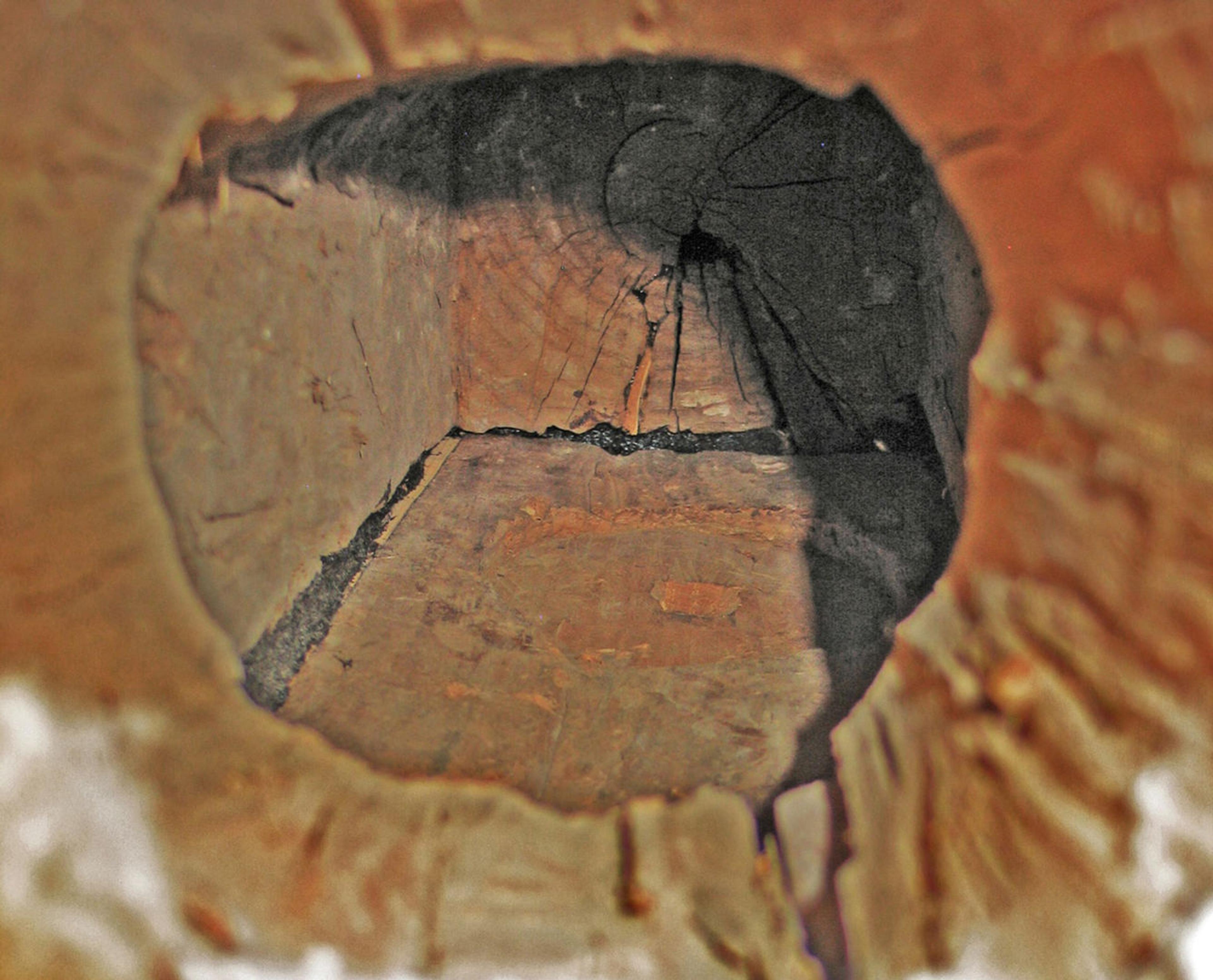 Looking inside the sculpture's torso from the bottom, with the sculpture lying on its back. The door to the back consecratory chamber features circular depressions for a mirror.