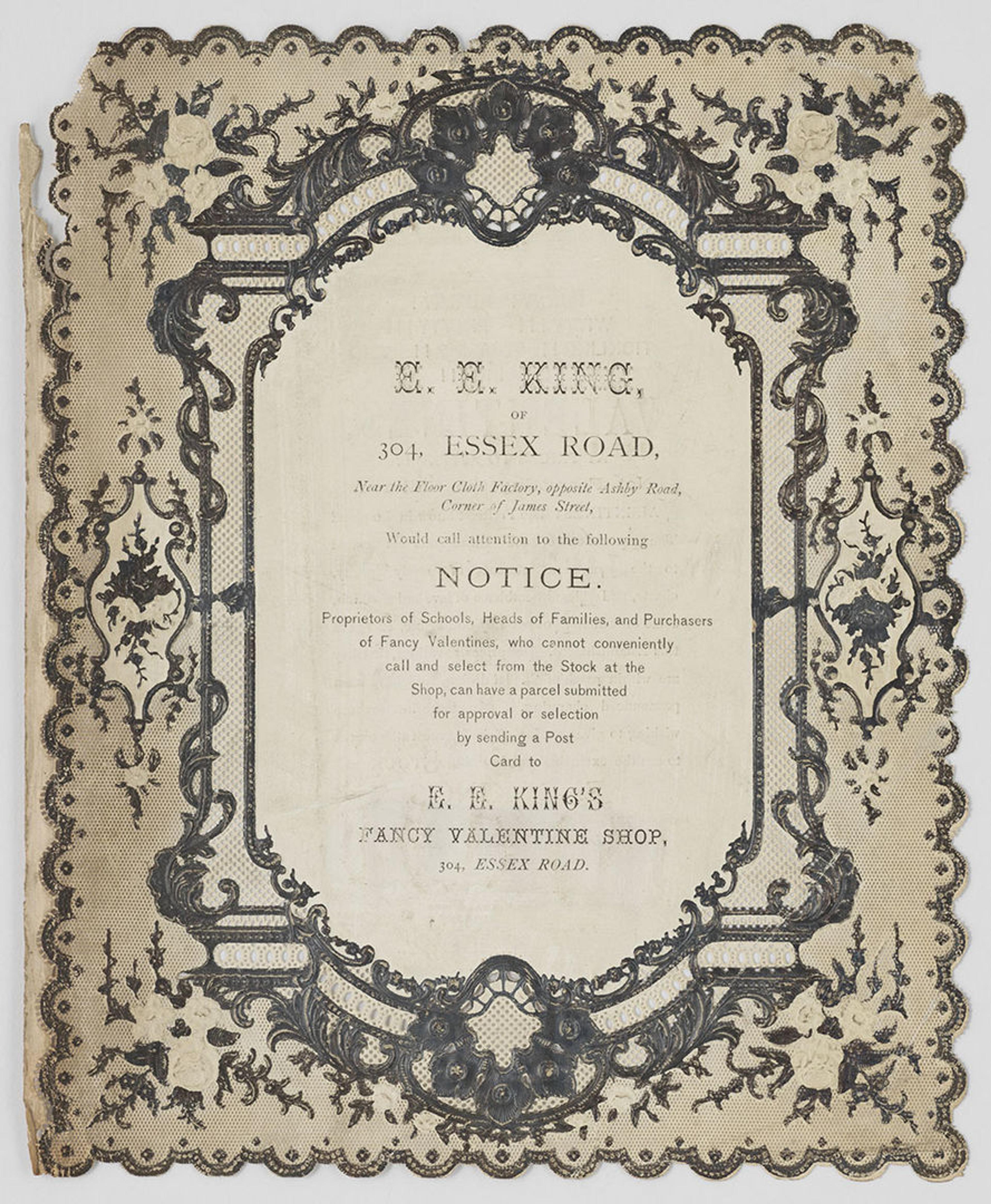 Anonymous, British, 19th century. Advertisement for E. E. King's Fancy Valentine Shop, ca. 1865. Silvered lace paper, wood engraving, sheet: 9 13/16 × 7 7/8 in. (25 × 20 cm). Gift of Mrs. Richard Riddell, 1984 (1984.1164.1826.1)