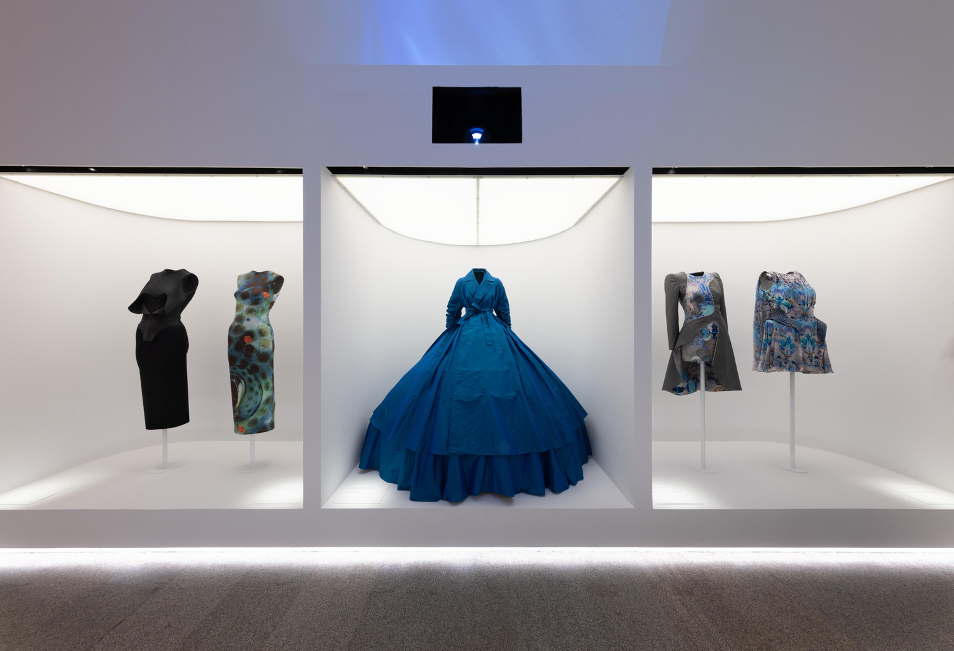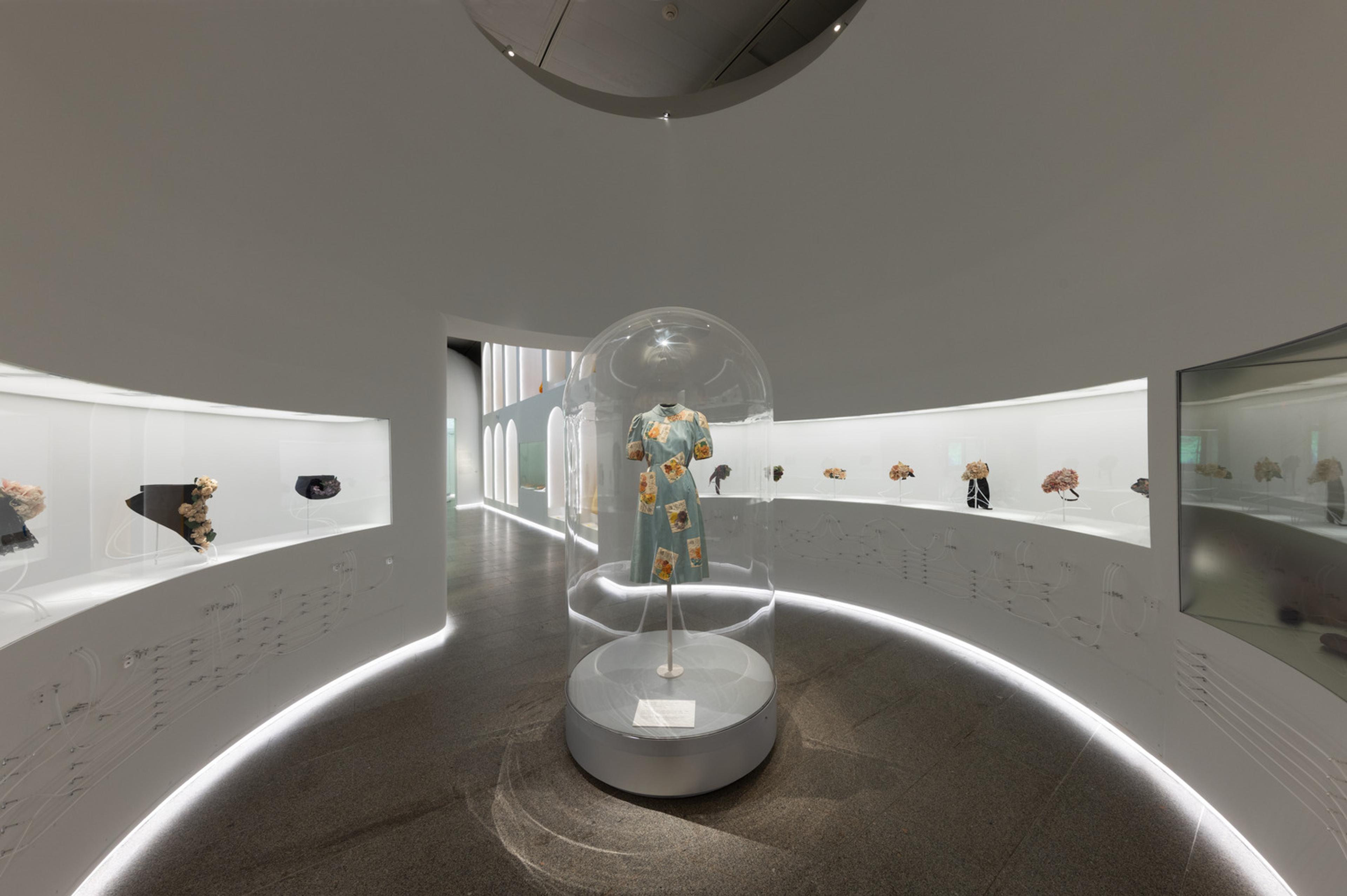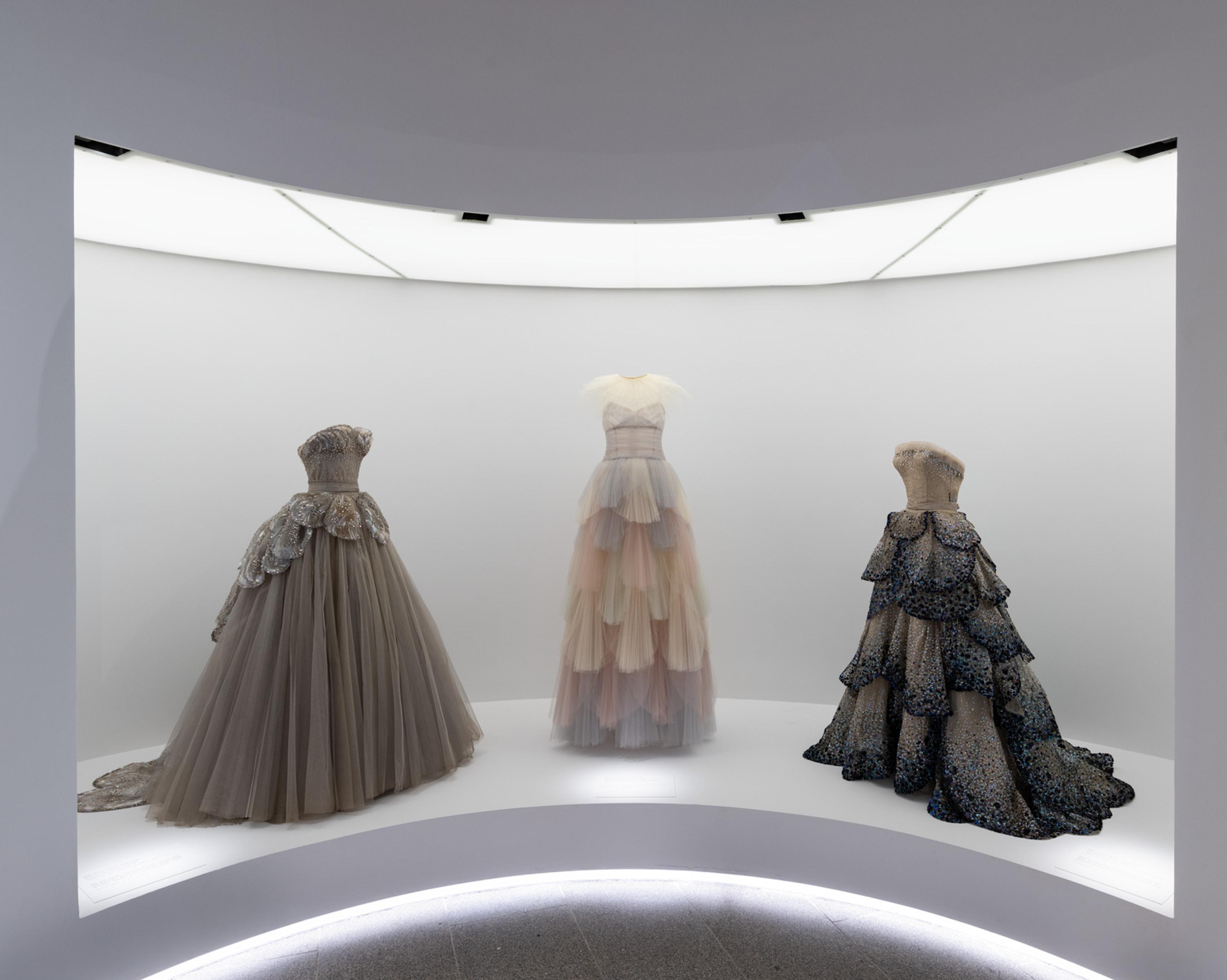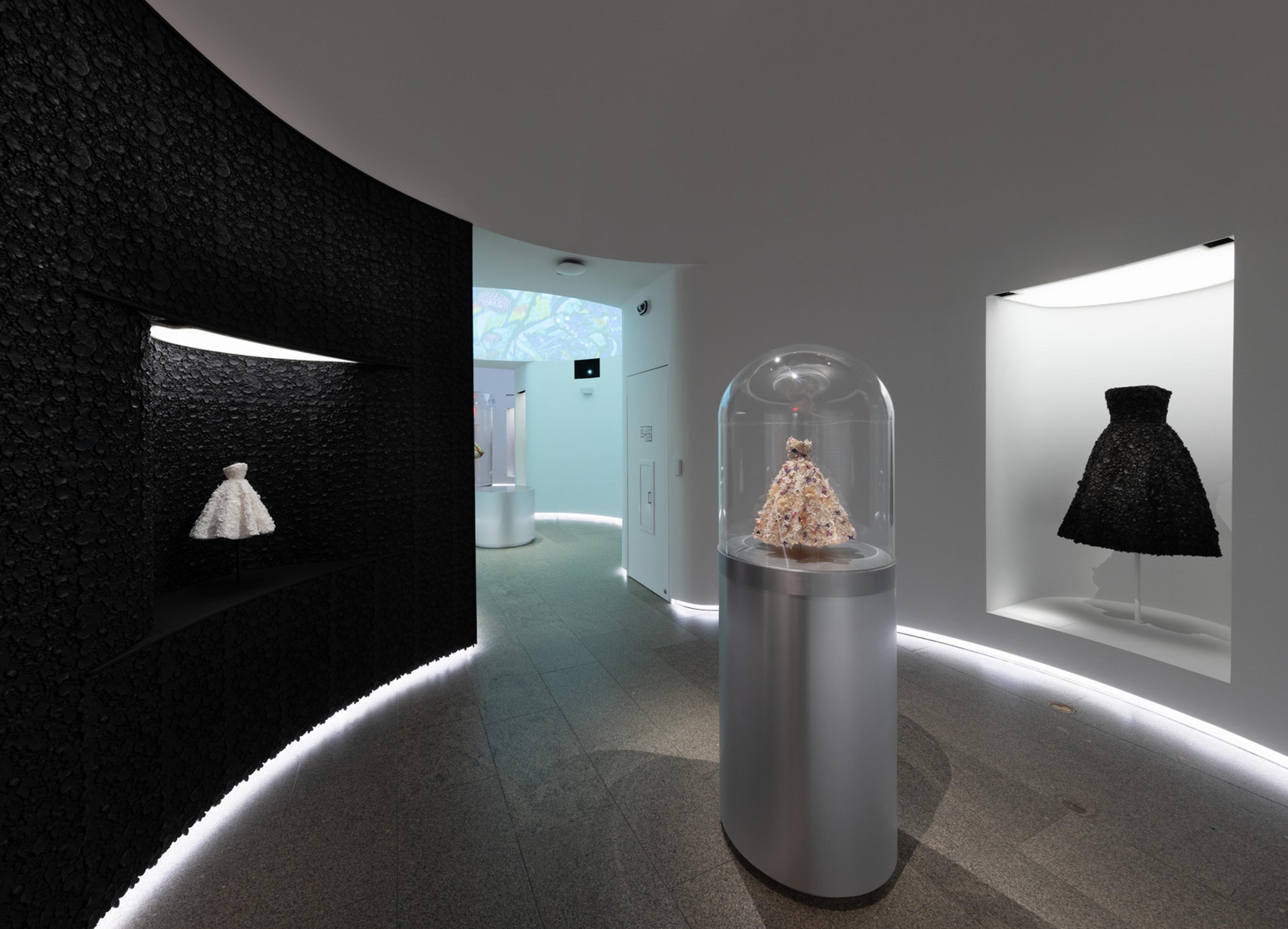 The House of Dior has repeatedly returned to “Miss Dior” as an emblem of its founder. The dress shown here is a miniature version of the original, inspired by the touring exhibition Le Théâtre de la Mode, organized to demonstrate the continued vitality of the haute couture following World War II. It was produced with the same virtuosic, artisanal exactitude as its full-scale sister, with silk flowers hand embroidered by Maison Lemarié. A 3D-printed plastic replica is displayed in the adjacent niche, allowing visitors to feel its form and the shapes of the flowers. Visitors are also encouraged to touch the surrounding urethane panels, which were cast from the flowers embroidered on Raf Simons’s interpretation of the “Miss Dior” dress and executed in black leather to allude to the eponymous perfume’s muskier base notes of leather, patchouli, and oakmoss.