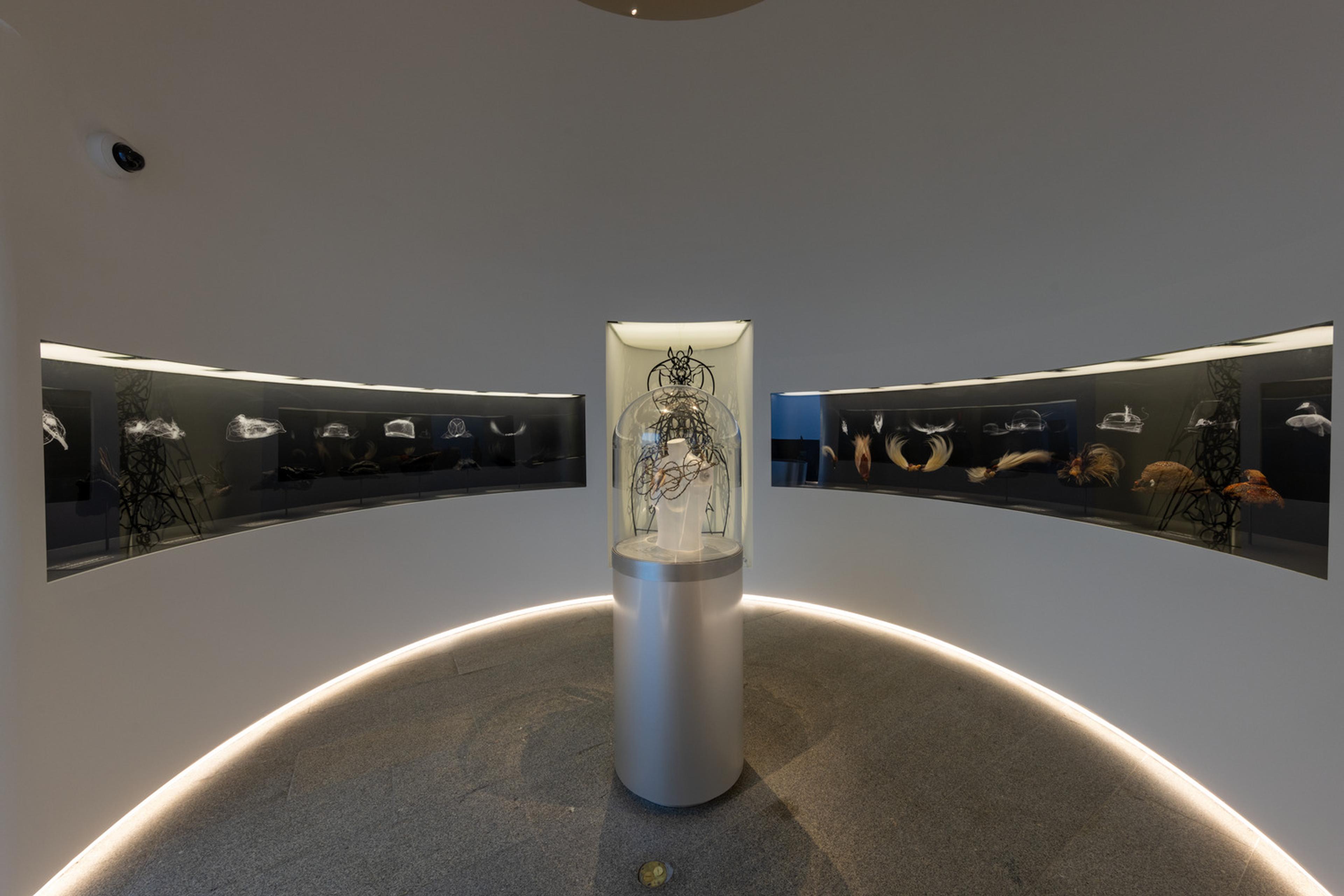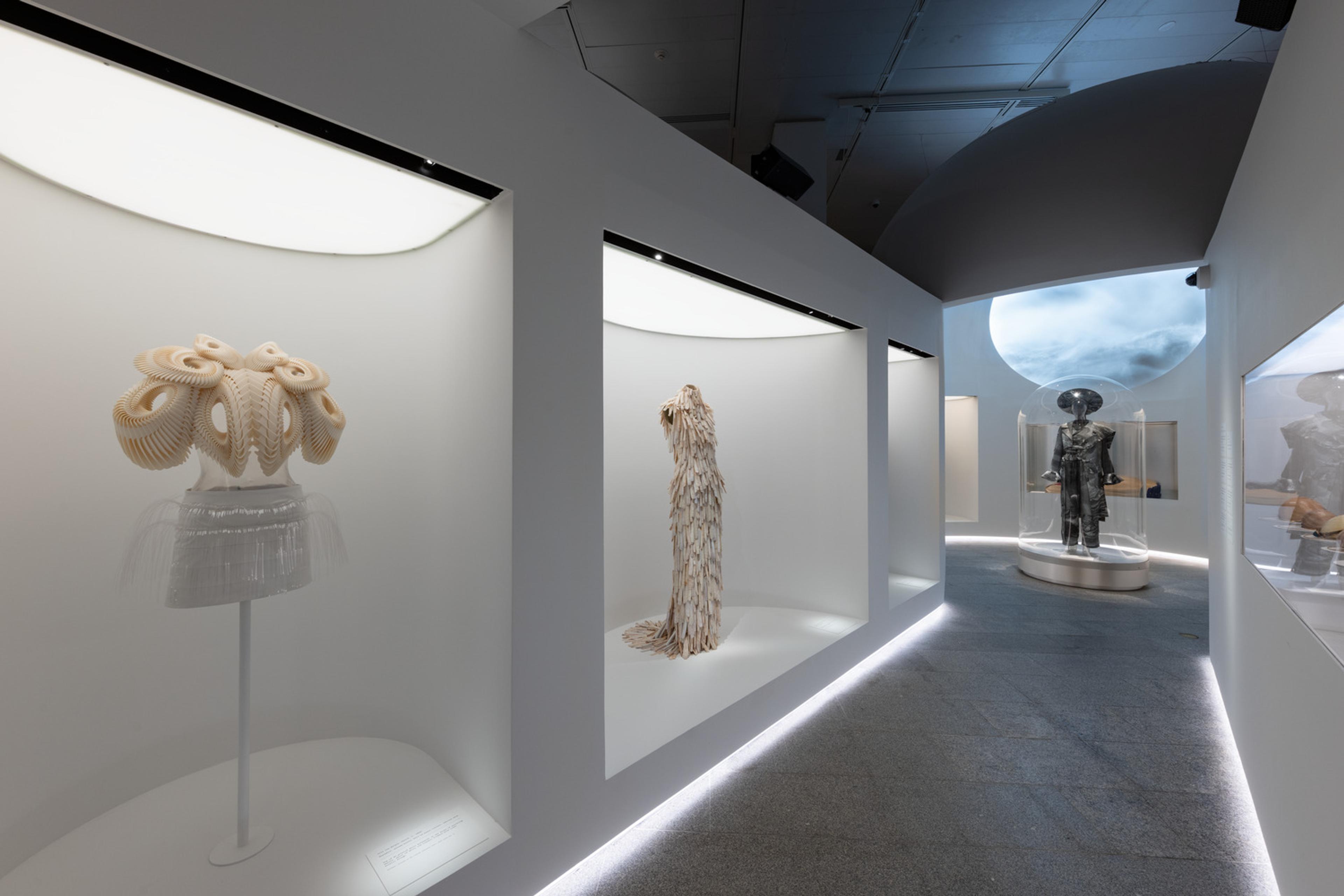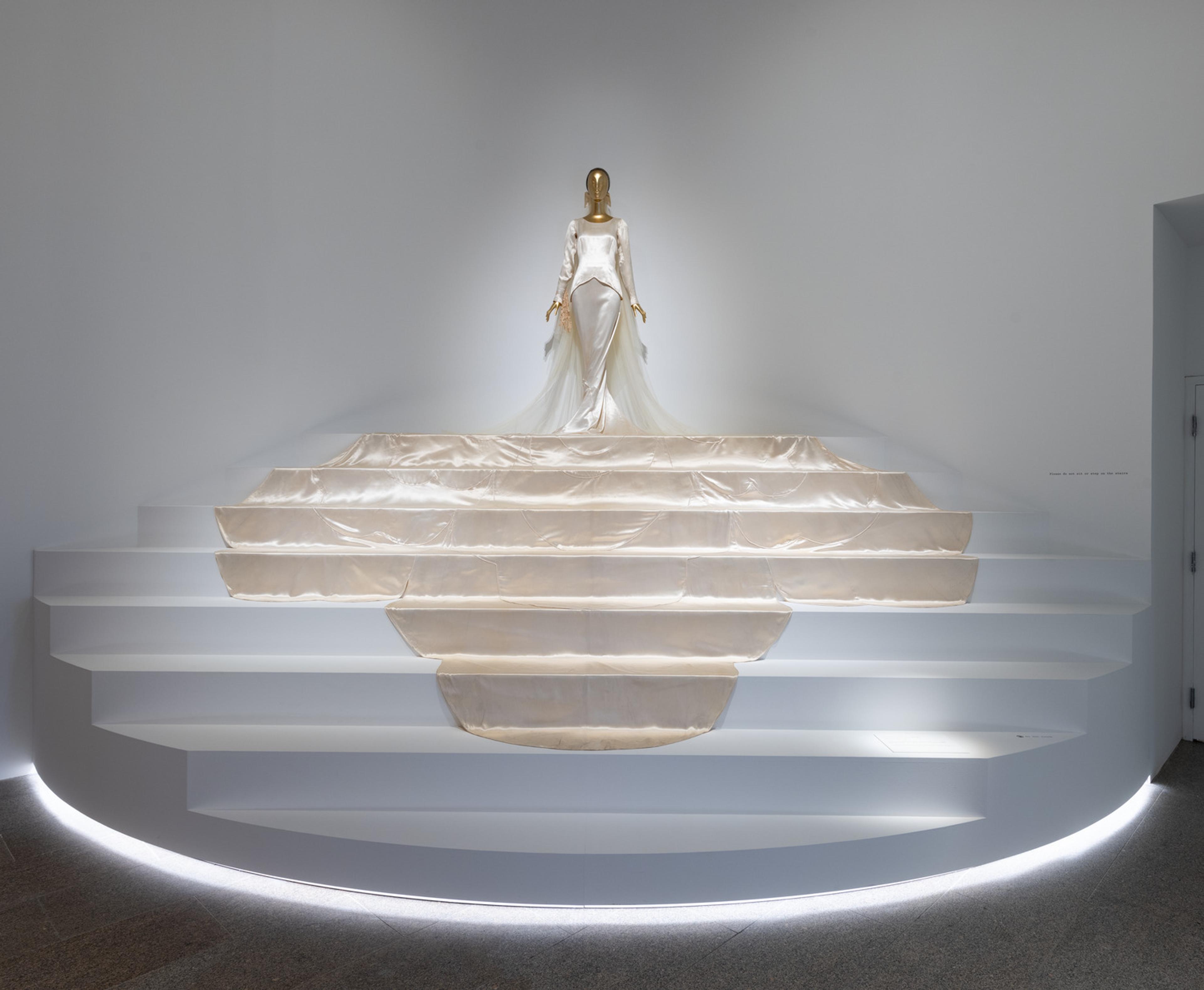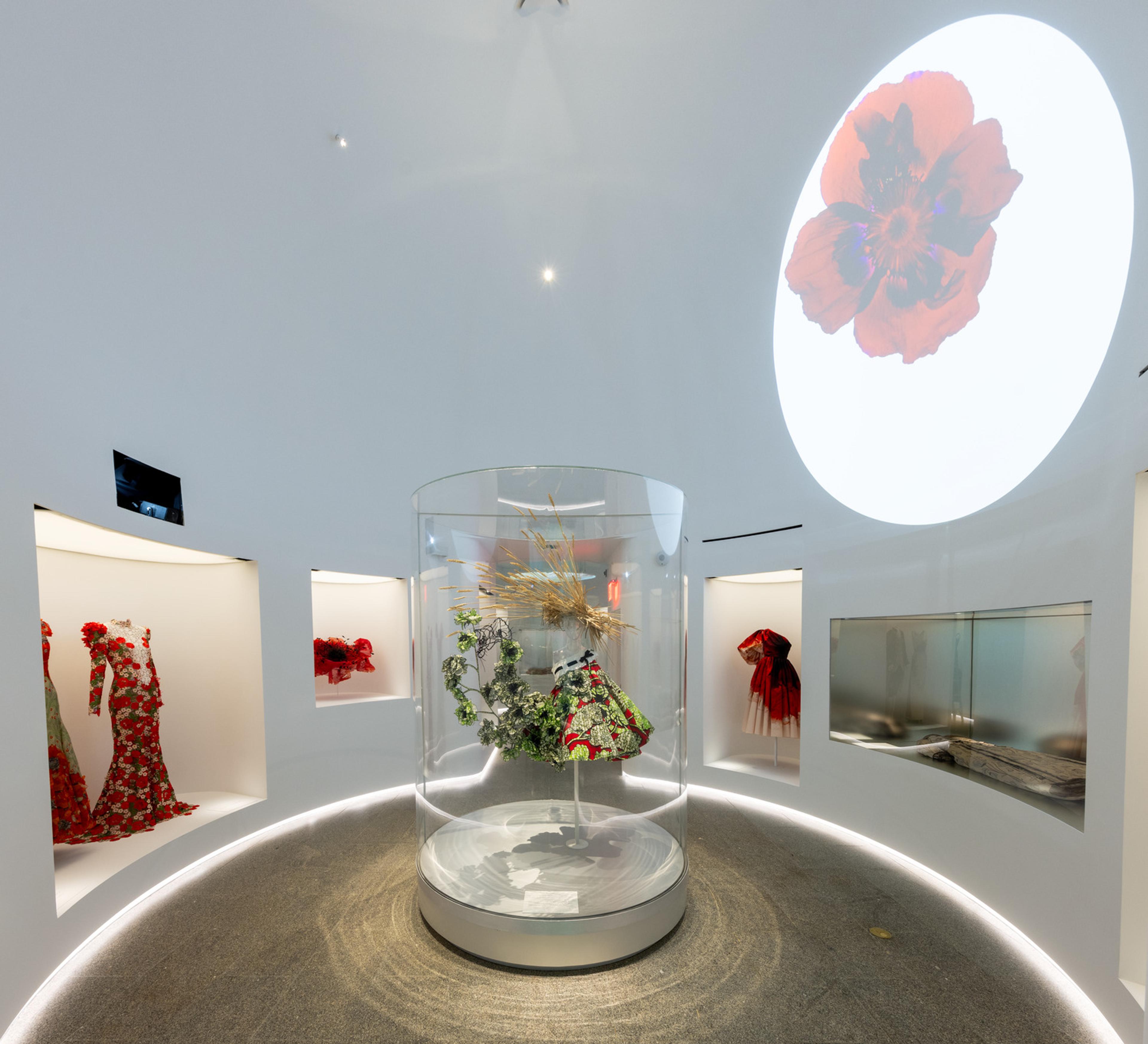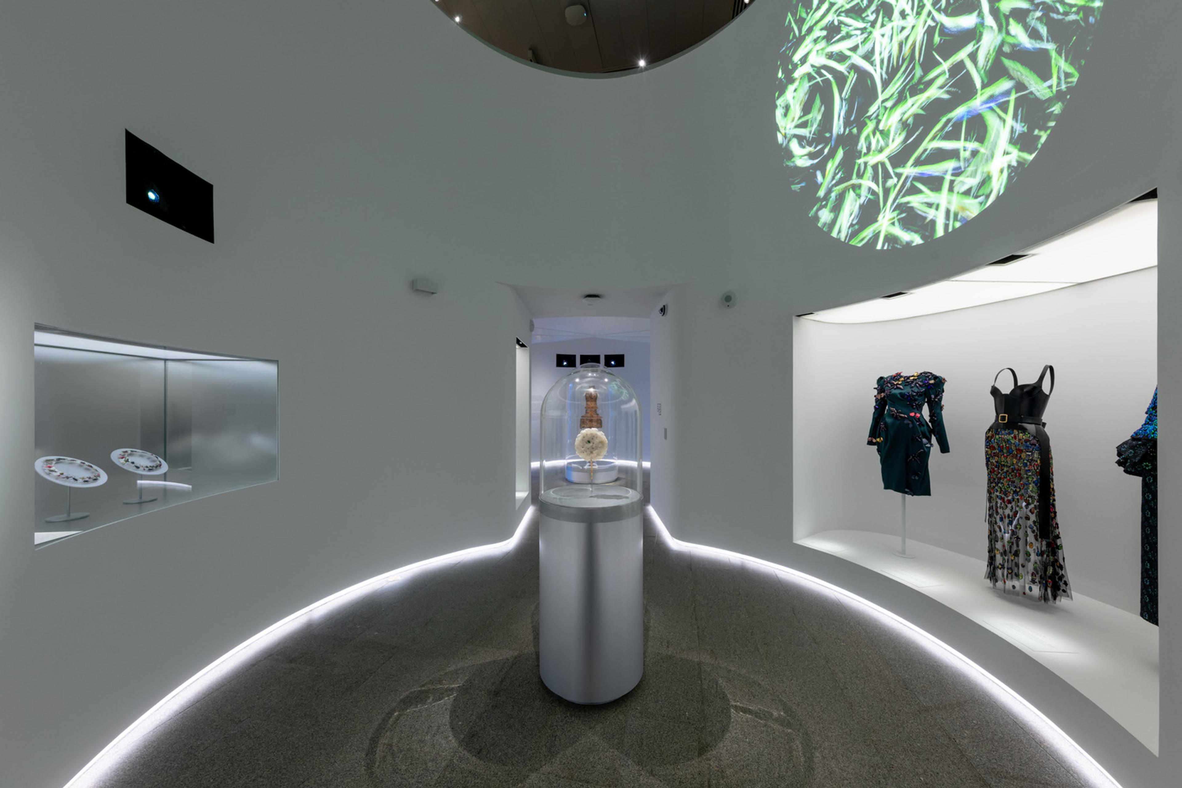 The House of Dior has repeatedly returned to “Miss Dior” as an emblem of its founder. The dress shown here is a miniature version of the original, inspired by the touring exhibition Le Théâtre de la Mode, organized to demonstrate the continued vitality of the haute couture following World War II. It was produced with the same virtuosic, artisanal exactitude as its full-scale sister, with silk flowers hand embroidered by Maison Lemarié. A 3D-printed plastic replica is displayed in the adjacent niche, allowing visitors to feel its form and the shapes of the flowers. Visitors are also encouraged to touch the surrounding urethane panels, which were cast from the flowers embroidered on Raf Simons’s interpretation of the “Miss Dior” dress and executed in black leather to allude to the eponymous perfume’s muskier base notes of leather, patchouli, and oakmoss.