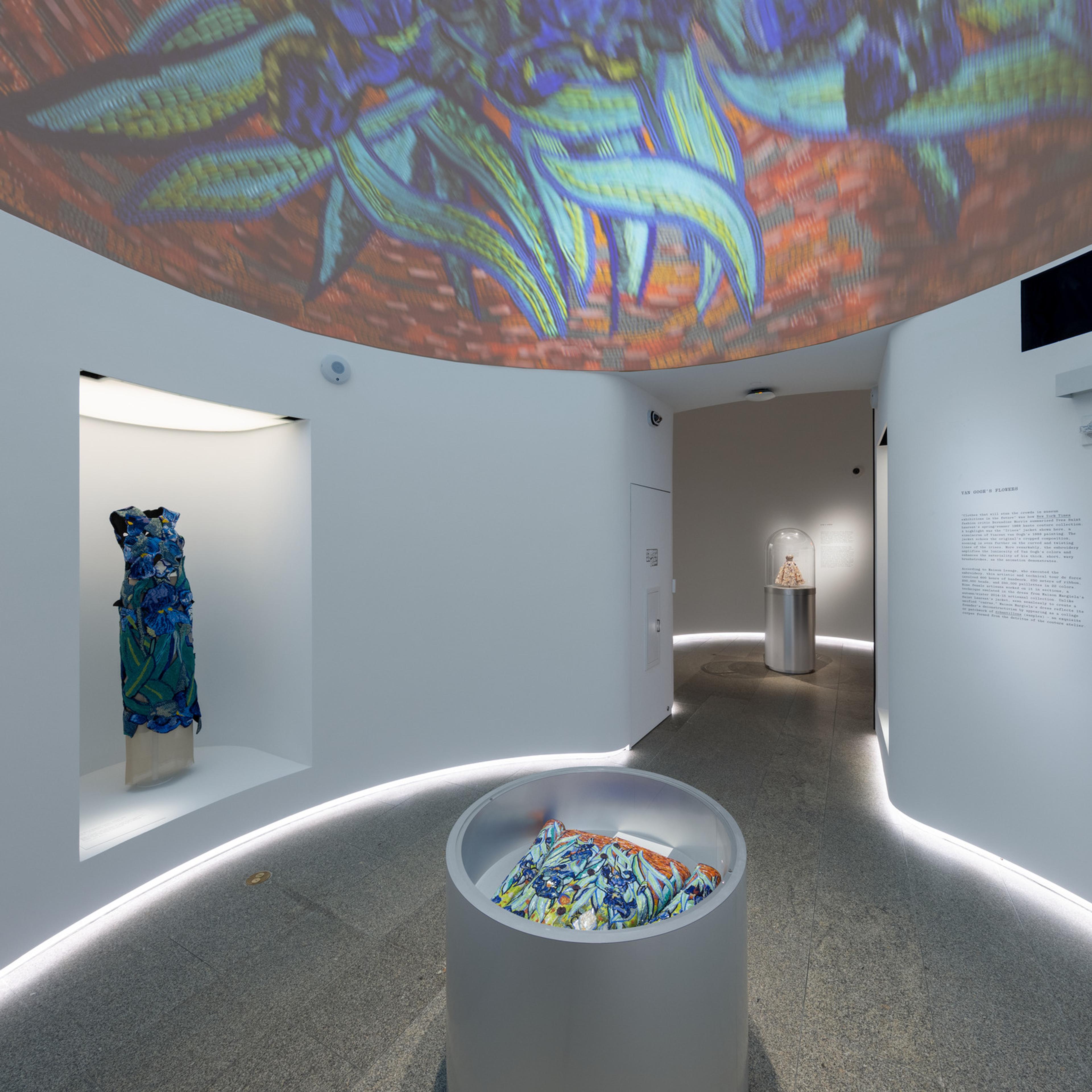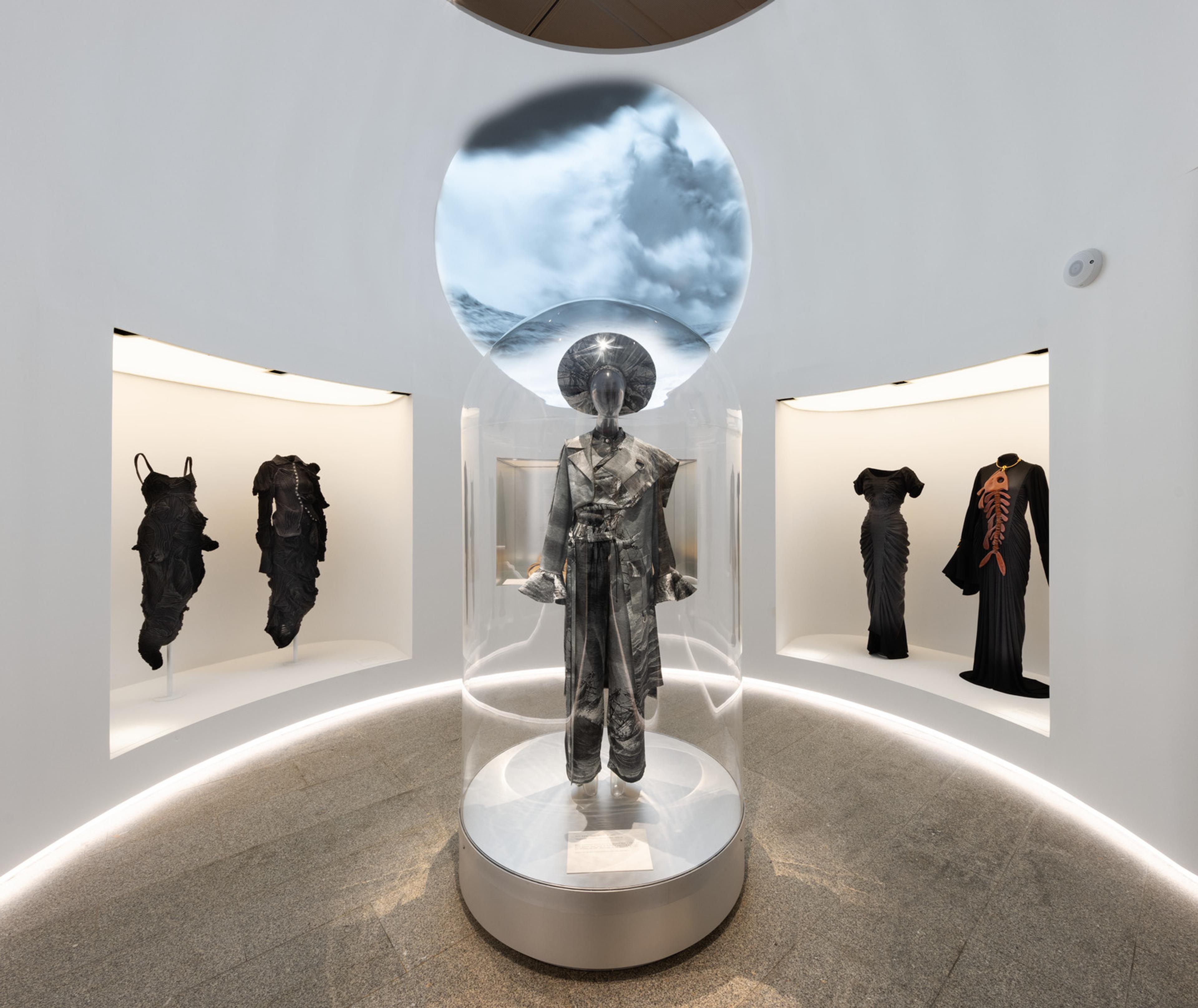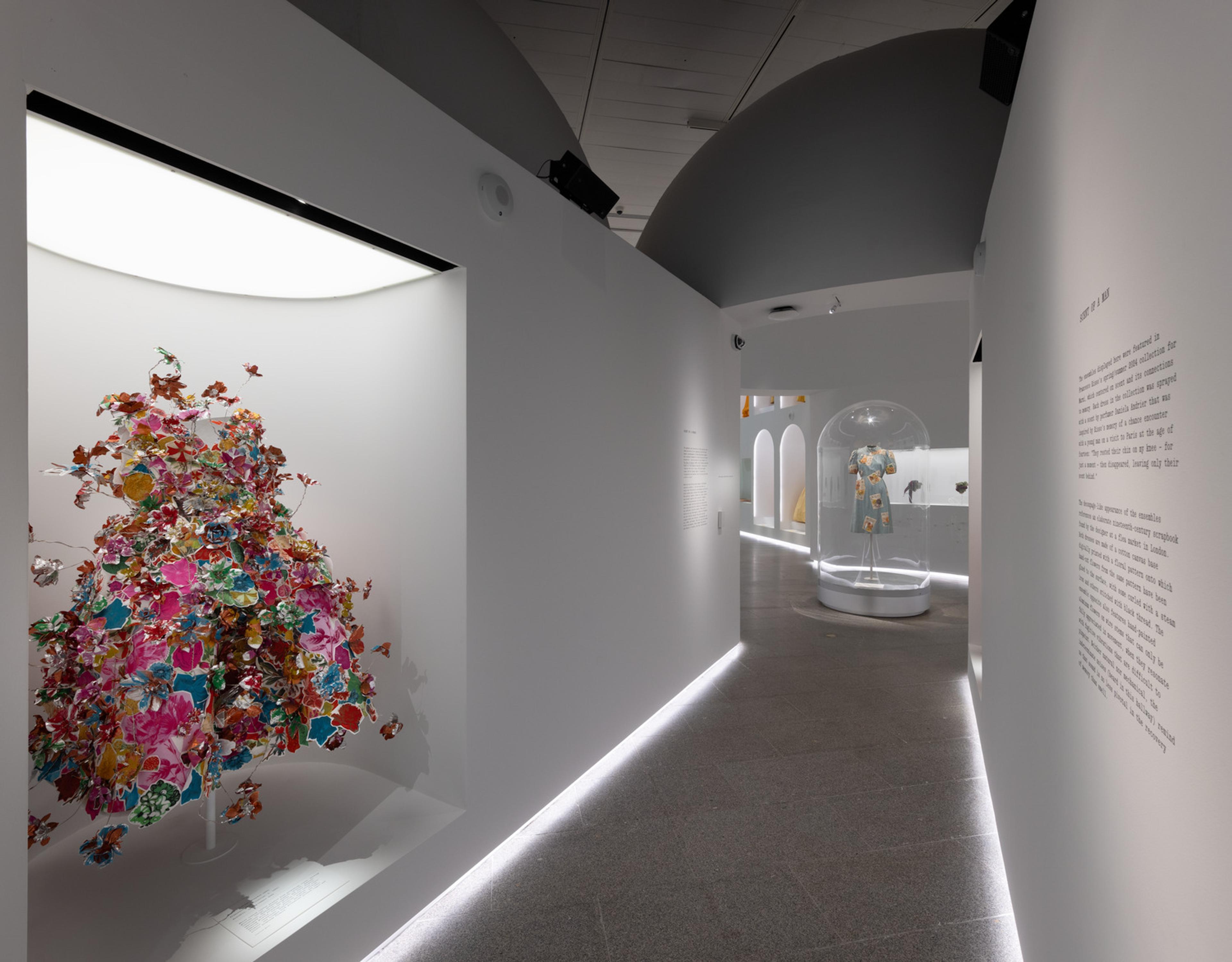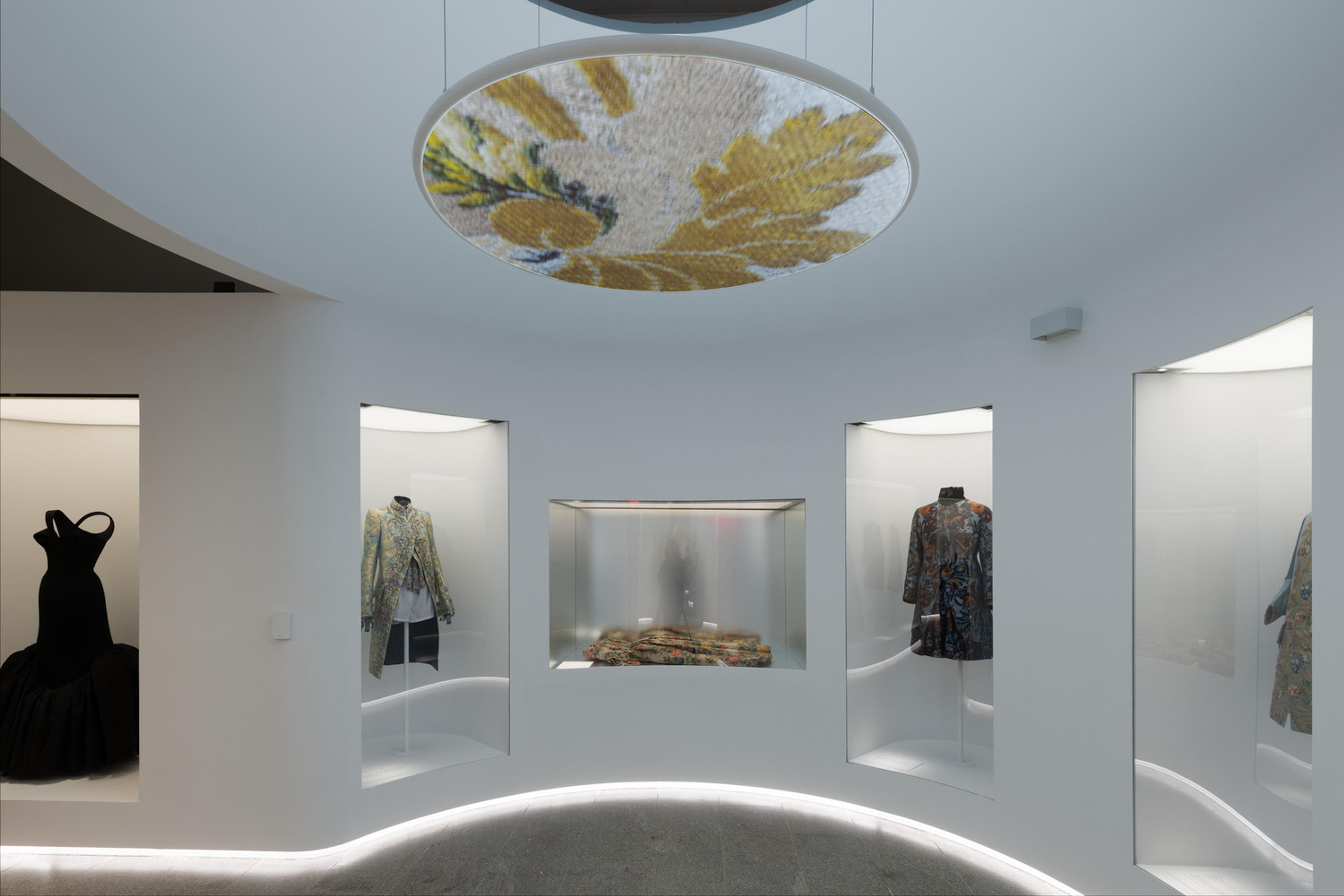 The House of Dior has repeatedly returned to “Miss Dior” as an emblem of its founder. The dress shown here is a miniature version of the original, inspired by the touring exhibition Le Théâtre de la Mode, organized to demonstrate the continued vitality of the haute couture following World War II. It was produced with the same virtuosic, artisanal exactitude as its full-scale sister, with silk flowers hand embroidered by Maison Lemarié. A 3D-printed plastic replica is displayed in the adjacent niche, allowing visitors to feel its form and the shapes of the flowers. Visitors are also encouraged to touch the surrounding urethane panels, which were cast from the flowers embroidered on Raf Simons’s interpretation of the “Miss Dior” dress and executed in black leather to allude to the eponymous perfume’s muskier base notes of leather, patchouli, and oakmoss.
