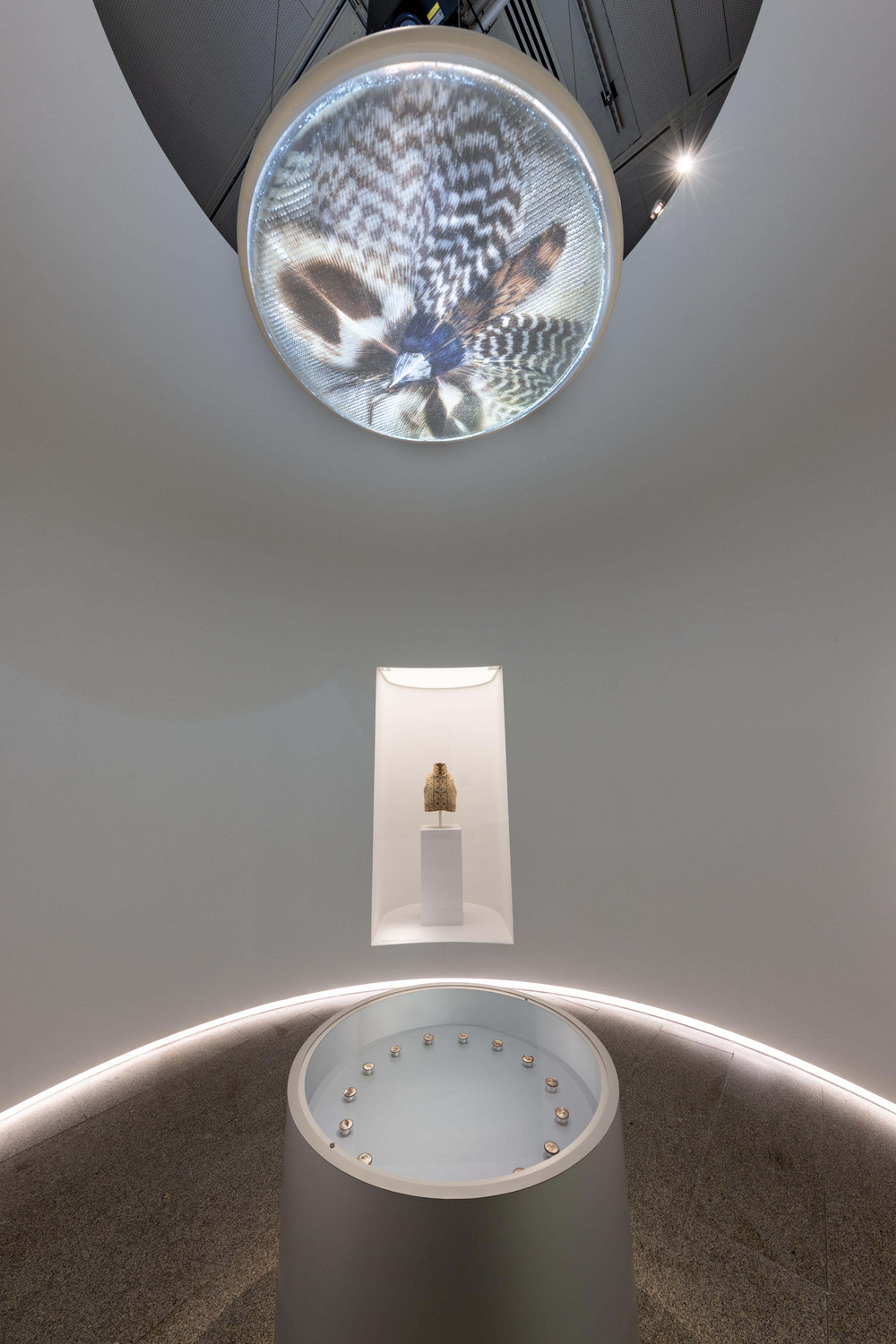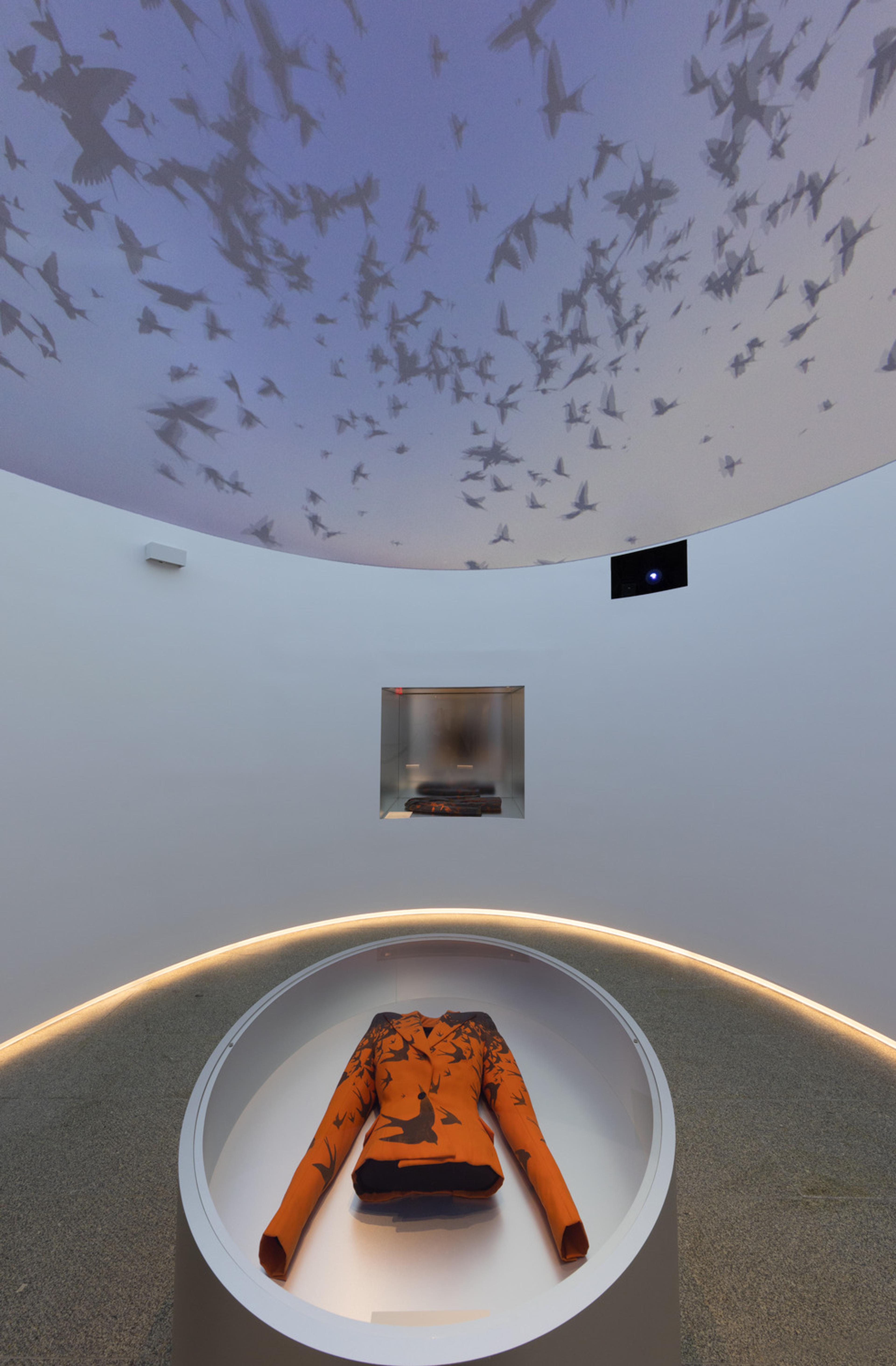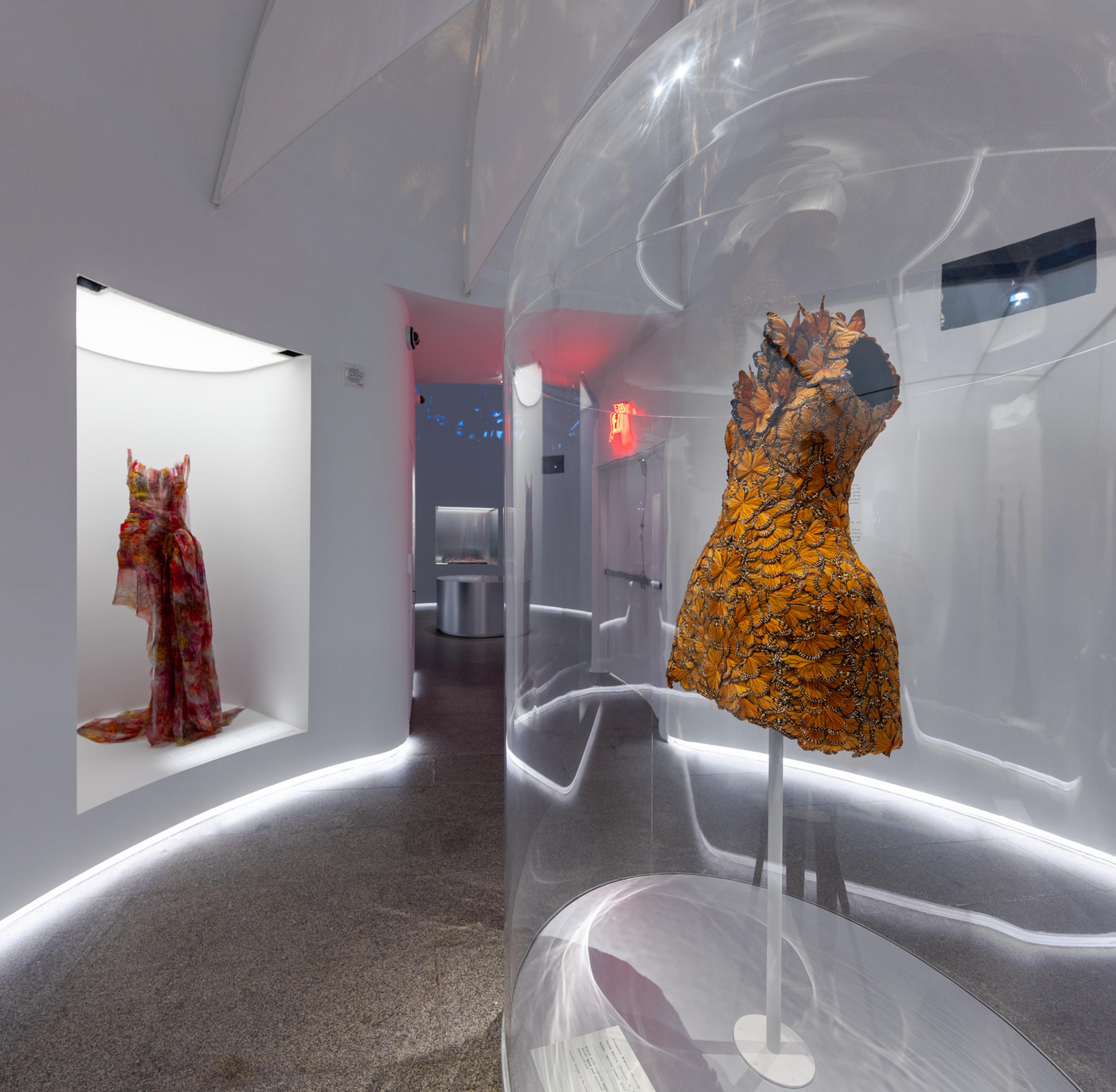 Sarah Burton’s dress was featured in her debut collection for Alexander McQueen, after its eponymous founder—and Burton’s mentor—took his own life eight months earlier. The dress is veneered with turkey feathers cut, dyed, and painted to emulate the iconic pattern of the monarch butterfly, which symbolizes hope, resilience, and endurance. These qualities are encapsulated in the butterfly’s annual three-thousand-mile migration across North America, a journey evoked in the animation filling the gallery.