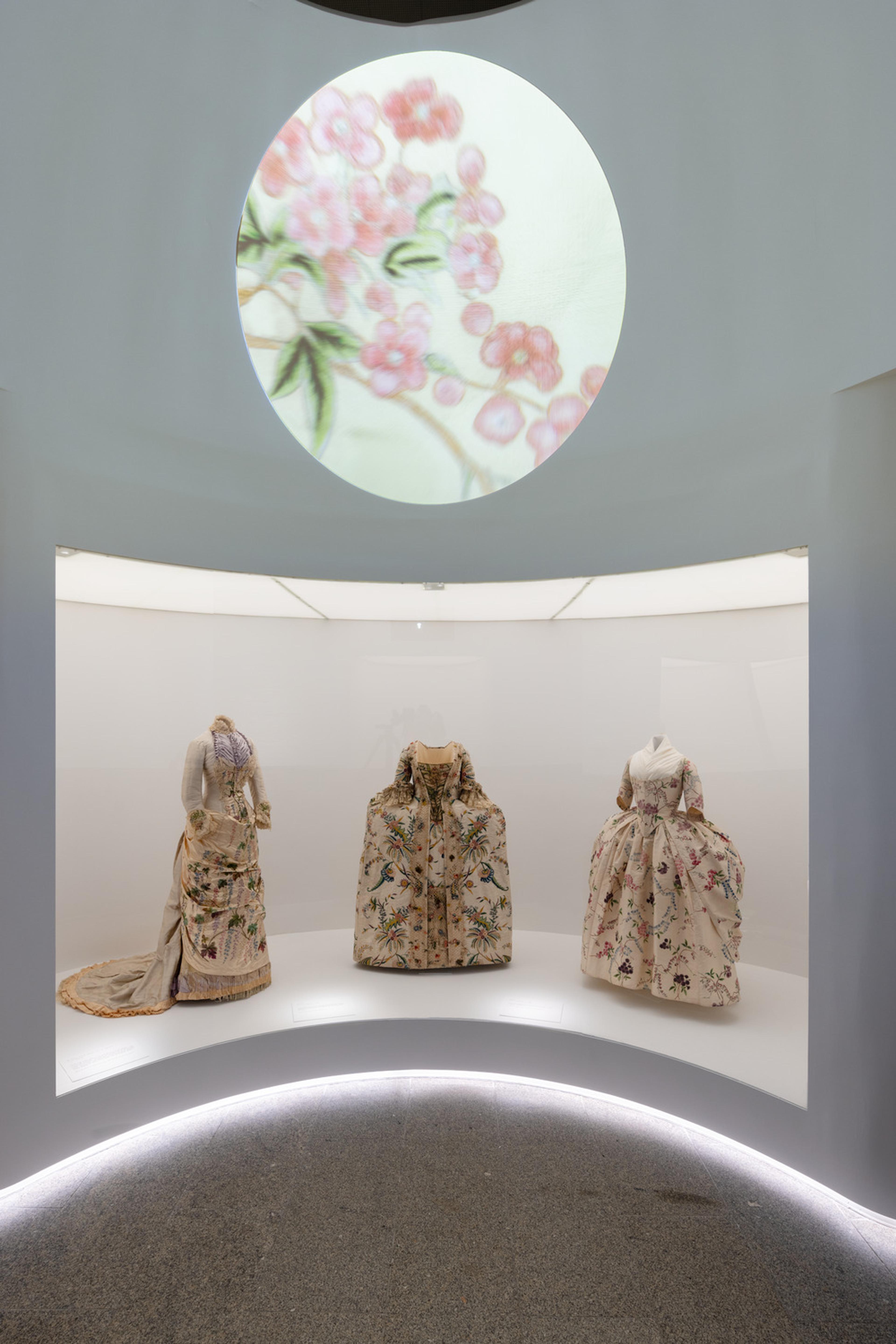 The galleries unfold as a series of case studies united by the theme of nature. Motifs such as flowers and foliage, birds and insects, and fish and shells are organized into three groupings: earth, air, and water, respectively. In many ways, nature serves as the ultimate metaphor for fashion—its rebirth, renewal, and cyclicity as well as its transience, ephemerality, and evanescence. The latter qualities are evident in the “sleeping beauties,” garments that are self-destructing due to inherent weaknesses and the inevitable passage of time, which ground several of the case studies.