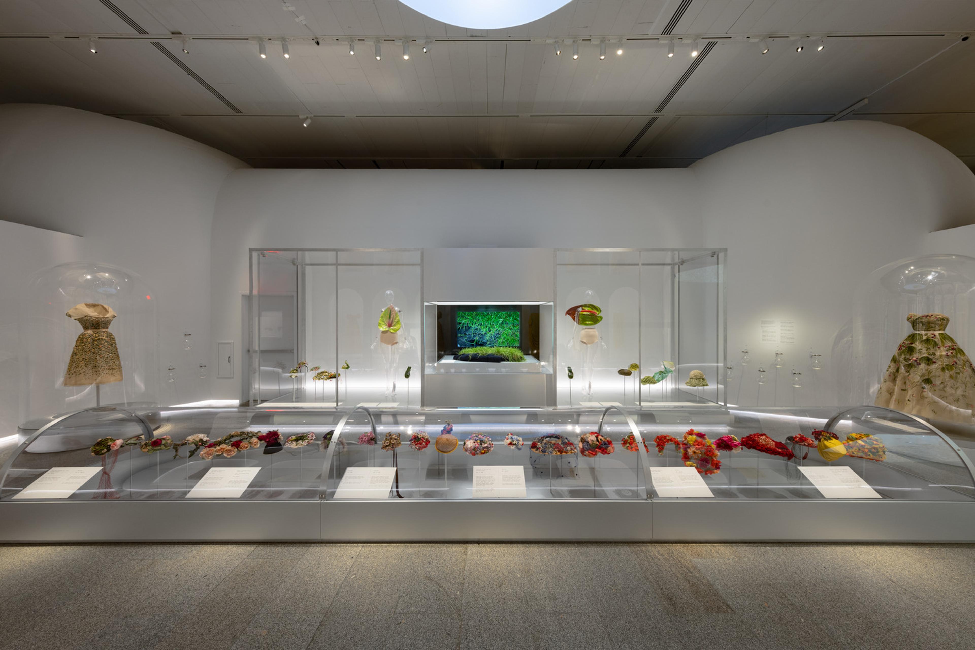 If, as Dior believed, a hat “can make you gay, serious, dignified, happy,” then the wearers of the blossoms in this Edenic gallery would have felt not only lighthearted but also lightheaded, as many of the hats were designed to be worn to dinner and cocktails. They bloom with a wide variety of flowers, including lilacs, roses, violets, clovers, pansies, poppies, carnations, and geraniums, rendered with a verisimilitude as if freshly plucked from the garden. This surrealist interchange between nature and artifice, reality and illusion extends to the glass orbs containing granules that reproduce the smell molecules of several of the hats on display, challenging our olfactory expectations and, in the process, our powers of reception and perception.