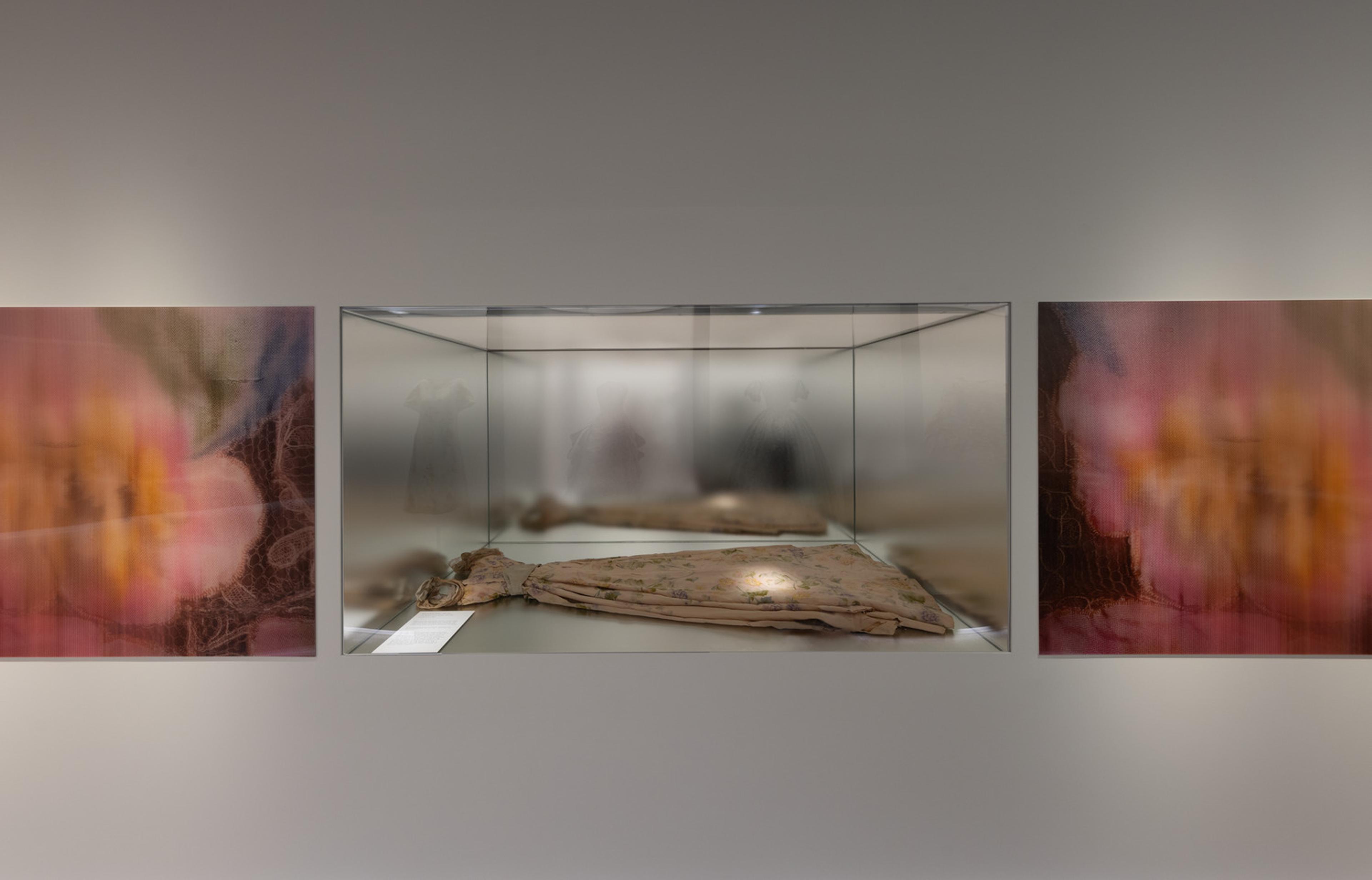 The decoupage-like appearance of the ensembles references an elaborate nineteenth-century scrapbook found by the designer at a flea market in London. Both dresses are made of a cotton canvas base digitally printed with a floral pattern onto which hand-cut flowers from the same pattern have been glued to the surface, with some curled with a steam iron and others stitched with black thread. The ensemble opposite also features hand-painted aluminum flowers on wire stems that can only be fully appreciated in movement, when they resonate with fugitive vibrations that are difficult to pinpoint. Neither natural nor mechanical, the indeterminate noises (heard in this hallway) remind us that sound is no less pivotal in the recovery of memory than smell.