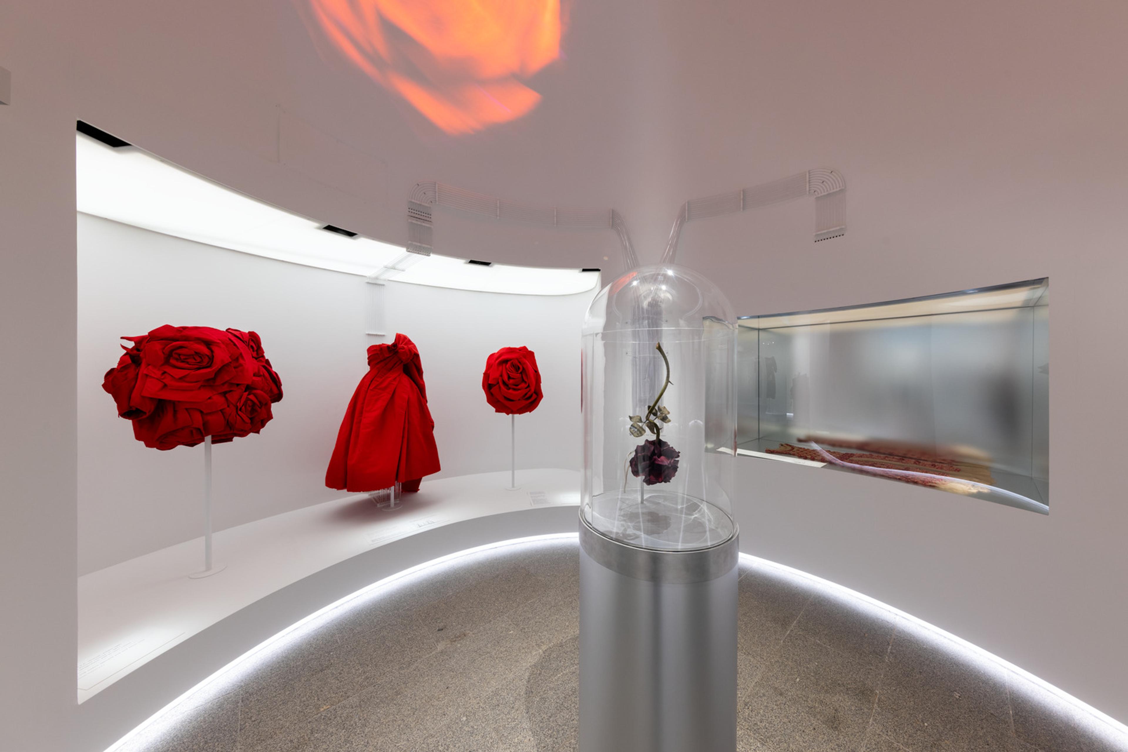 Philip Treacy’s startlingly lifelike headpiece evokes the flower’s fragility, as visualized in the animation and as also realized in the “sleeping beauty,” whose smell molecules, along with those of Yves Saint Laurent’s evening dress, emanate from the tubes on the wall. Saint Laurent’s lyrical confection as well as Pierpaolo Piccioli’s pay homage to their respective houses’ founders, who both shared a passion for roses and the color red.