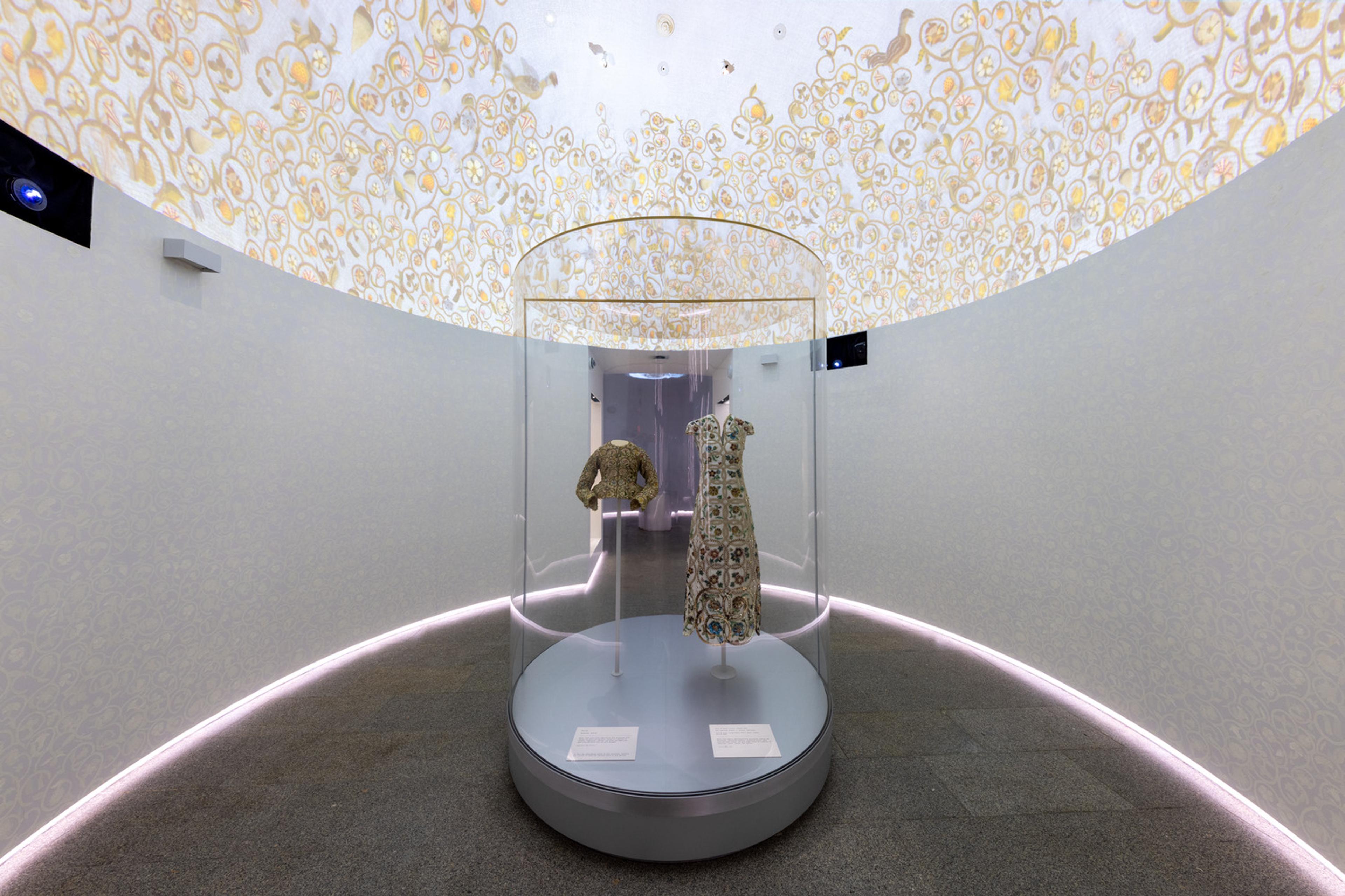 Gardening and embroidery were closely allied in the late sixteenth and early seventeenth centuries, with each discipline borrowing from the other to create intricate works of human artifice that both reflected and perfected nature’s untamed beauty. A style of gardening known as “embroidered” became popular throughout Europe, imitating the needlework seen on garments such as the women’s waistcoat—a type of informal jacket—from about 1615–20 displayed in this gallery. Its embroidery depicts an English garden seething with vitality: strawberries ripen, peapods burst open, and birds snatch at dragonflies and caterpillars, a dynamic arcadia brought to life by the animation on the domed ceiling. Some of the tactile experience of wearing such a densely embroidered garment—which combines braided gold threads, glass beads, silver wire, and metallic lace—is made available on the walls of the gallery.