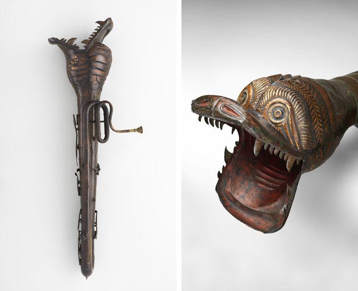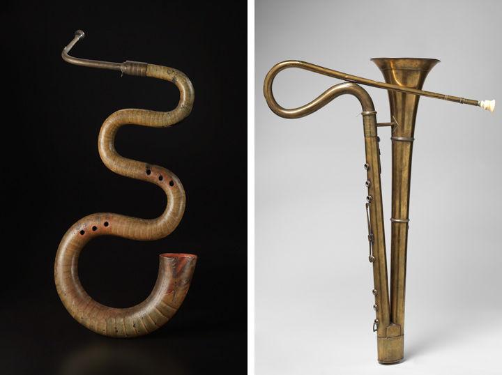 Left: C. Baudouin (French). Serpent, ca. 1820. Paris, France. Wood, leather, paint, brass, 32 3/4 x 4 3/4 x 10 1/4 in. (83.2 x 12.1 x 26 cm). The Metropolitan Museum of Art, New York, Purchase, Robert Alonzo Lehman Bequest, 2012 (2012.568a–c). Right: Frederick Pace (British, 1805–1835). English bass horn in B-flat, ca. 1835. London, England, United Kingdom. Brass, 34 x 7 3/4 x 25 1/8 in. (86.4 x 19.7 x 63.8 cm); diameter (of bell): 7 13/16 in. (19.8 cm). The Metropolitan Museum of Art, New York, The Crosby Brown Collection of Musical Instruments, 1889 (89.4.2028)