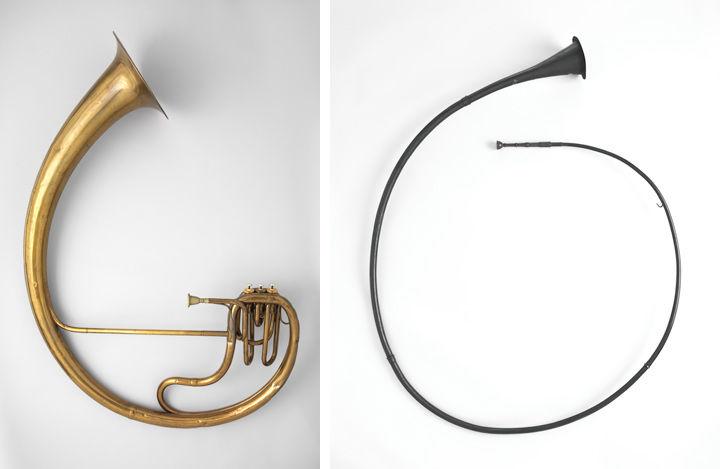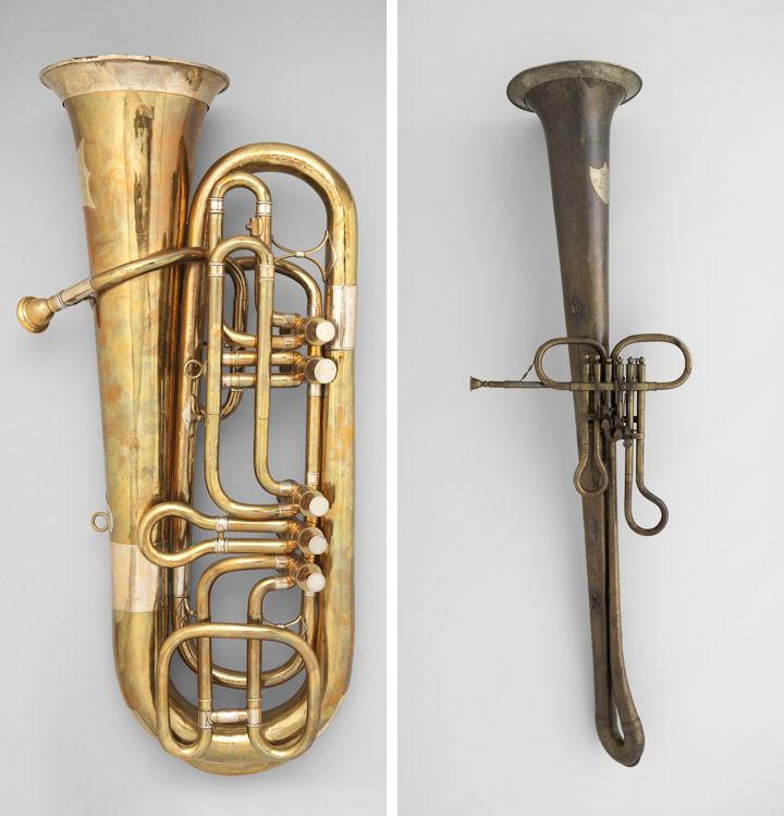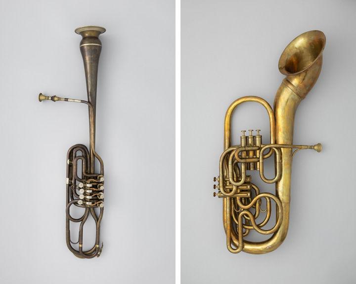 Left: Adolphe (Antoine Joseph) Sax (Belgian, 1814–1894). Bass saxtuba in E-flat, 1855. Paris, France. Brass, 51 x 36 1/2 x 12 1/2 in. (129.5 x 92.7 x 31.8 cm). The Metropolitan Museum of Art, New York, The Crosby Brown Collection of Musical Instruments, 1889 (89.4.1109). Right: Cornu (reproduction), late 19th century. Italian (Roman reproduction). Metal, wood, 47 1/2 x 39 1/8 x 5 1/16 in. (120.7 x 99.4 x 12.9 cm). The Metropolitan Museum of Art, New York, The Crosby Brown Collection of Musical Instruments, 1889 (89.4.1089)