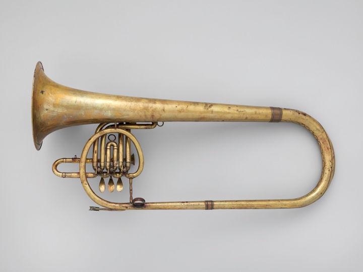Left: Clavicorno fagotto (brass bassoon) in B-flat, ca. 1888. Italian. Brass, nickel-silver, 36 1/8 x 7 x 11 in. (91.8 x 17.8 x 27.9 cm). The Metropolitan Museum of Art, New York, The Crosby Brown Collection of Musical Instruments, 1889 (89.4.2589). Right: Adolphe (Antoine Joseph) Sax (Belgian, 1814–1894). Bass saxhorn in B-flat, 1863. Paris, France. Brass, 32 1/2 x 19 x 8 in. (82.6 x 48.3 x 20.3 cm). The Metropolitan Museum of Art, New York, Purchase, Clara Mertens Bequest, in memory of André Mertens, 1993 (1993.164)