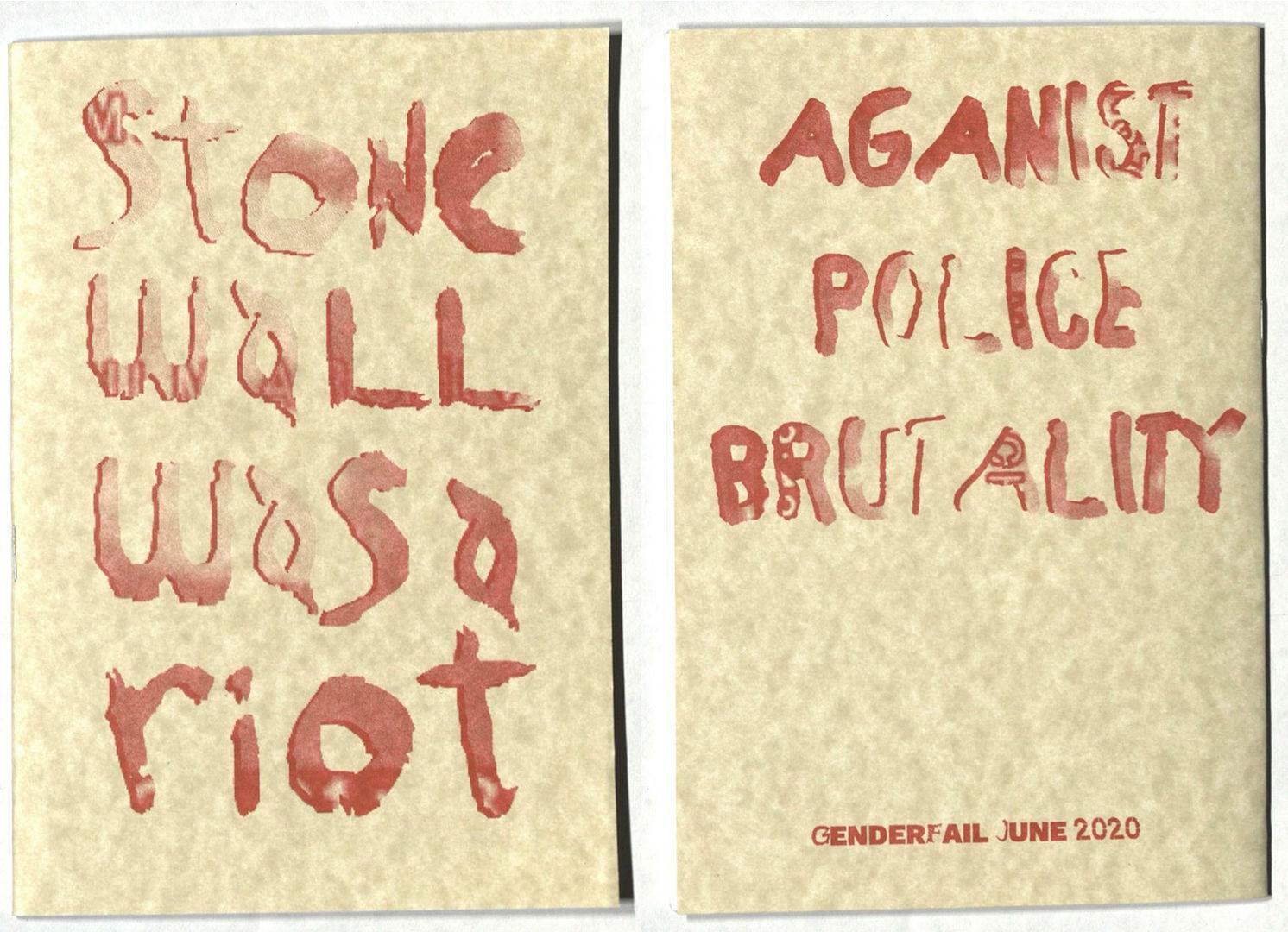 Zines are commonly used to reflect on and share histories, particularly those of historically marginalized communities. In 2015, Brooklyn-based artist Be Oakley started GenderFail, a publishing and programming initiative that seeks to encourage projects that foster an intersectional queer subjectivity. GenderFail has published work by thirty artists, including the zine Stonewall Was A Riot shown below. This zine, created by Be Oakley, includes an essay from Brett Suemnicht's VCUarts MFA Thesis “GenderFail: The Queer Ethics of Dissemination.”
