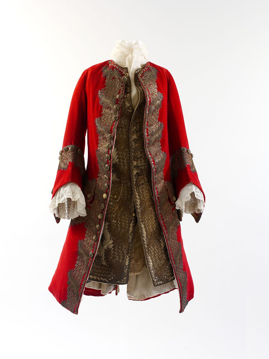 Questa giubba elaborata è un esempio raffinato di eleganza lussuosa e abilità artigianale nel campo dell’abbigliamento maschile nella prima metà del Settecento. Il modello abbondante della giubba irrobustita da crini di cavallo e i particolari degli ampi polsini sono caratteristici delle misure eccessive in voga all’ epoca. Questi elementi sartoriali sono ben visibili nei quadri esposti nel Museo, in particolare nel ritratto di André François Alloys de Theys d’Herculais eseguito da Nicolas de Largillière nel 1727. Il ricamo con filo dorato su panno di lana rosso era una delle forme ornamentali più sontuose dell’ epoca. La decorazione sul panciotto abbinato è particolarmente preziosa, con il motivo a piuma svolazzante in filato e lustrini dorati.