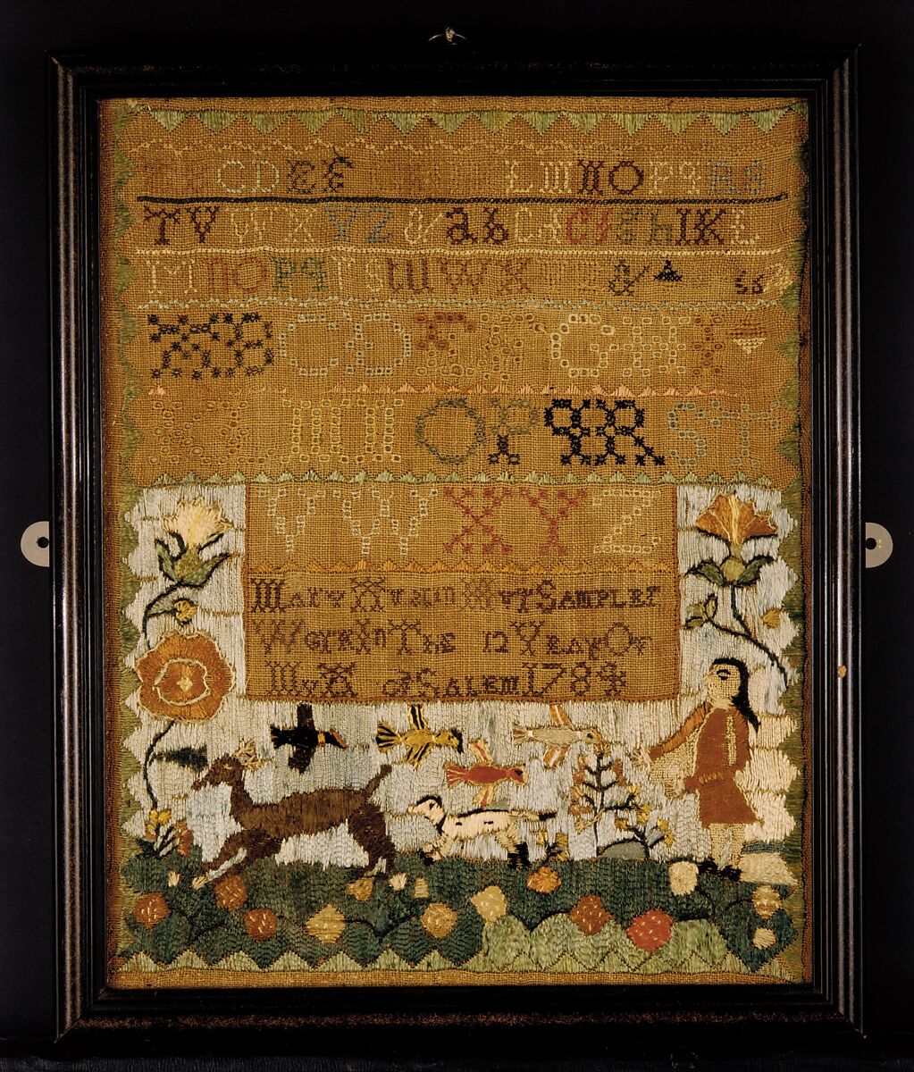 Mary Austin’s sampler is one of the few late eighteenth-century samplers of its type to name Salem as the place where it was made. However, it is not known which of the city’s many schools she attended. It is unmistakably a Salem sampler due to the long, unraveled silk stitches that create the naïve rendering of the colorful scene below the large block with rows of alphabets. Here a single male figure stands in profile watching his black and white dog chase after a leaping stag, with four frightened birds escaping in the opposite direction. The long stitches in Mary’s blue sky and green grass go straight up, rather than being organized diagonally, which is more commonly seen in Salem samplers. The folk-like whimsy of the scene is in contrast to the formulaic stitching of the six rows of alphabets and inscription above, suggesting that Mary may have drawn her own figures, animals and birds in a composition to suit her own fancy. By comparison, The Met has another Salem sampler worked in 1766 by Rebekah White (1753-1823) with figures more directly inspired or copied from illustrations taken from books of poetry and songbooks. (See: 1984.331.8)