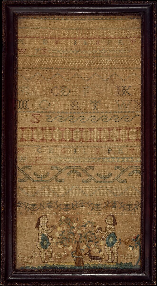 Signed and dated beside the figures, this sampler is characteristic of a group of nine known samplers produced between 1724 and 1749 in the Boston area by girls ages 8 to 13. As here, most of Boston’s Adam and Eve samplers retain the long narrow proportions commonly found in similar earlier English examples. The first four band patterns occur in the same order on at least five other examples and are unique to samplers made in Boston in this period. The hexagonal band pattern at the center of the sampler is found only in Boston-area needlework of the eighteenth century.